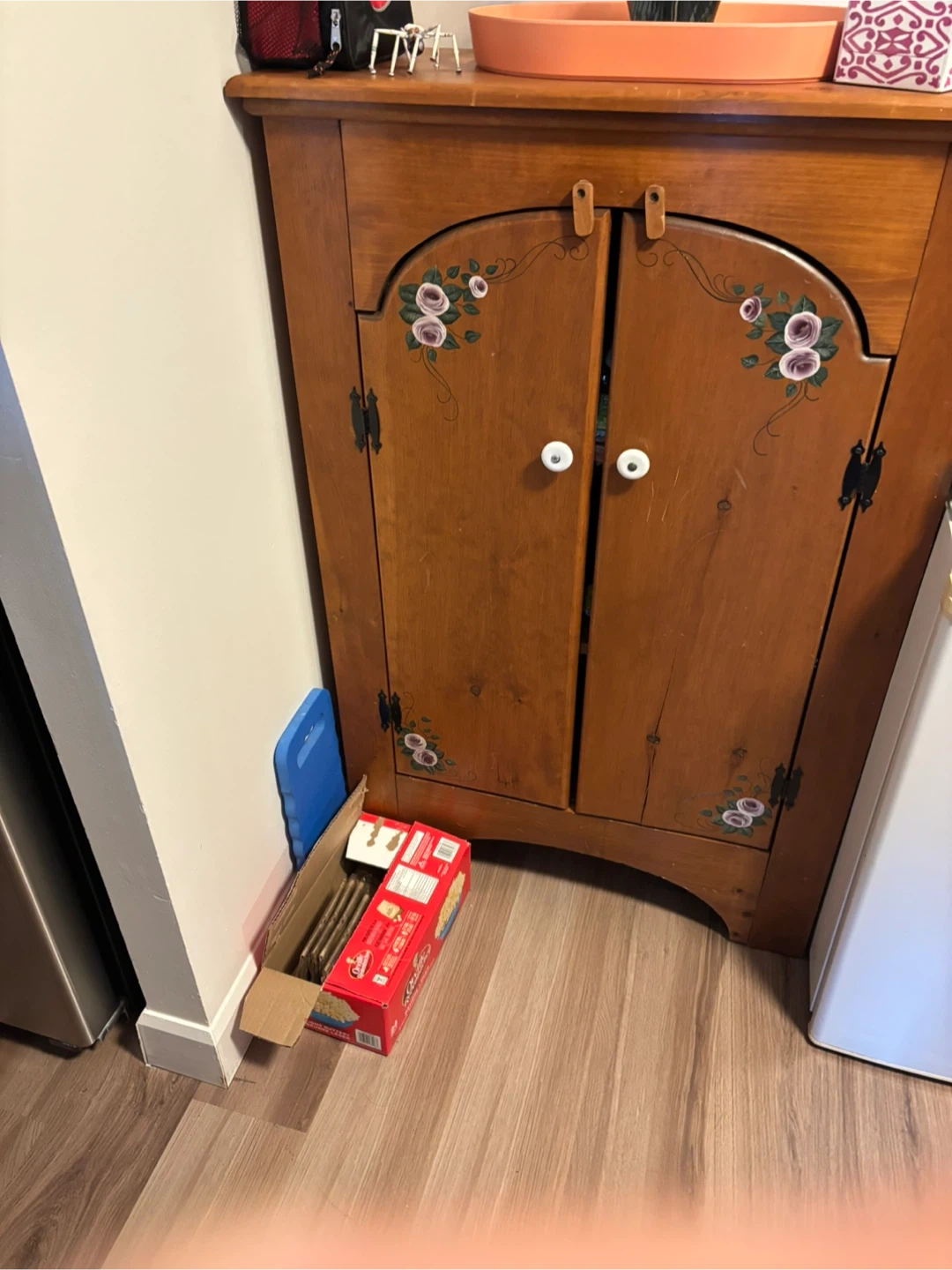 Here's a charming wooden corner cabinet! It features a lovely floral design and would be a great addition to any room. It's a unique piece that could be used for storage or display