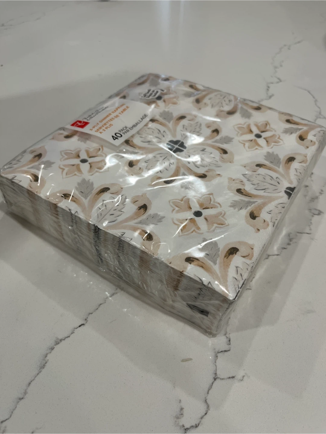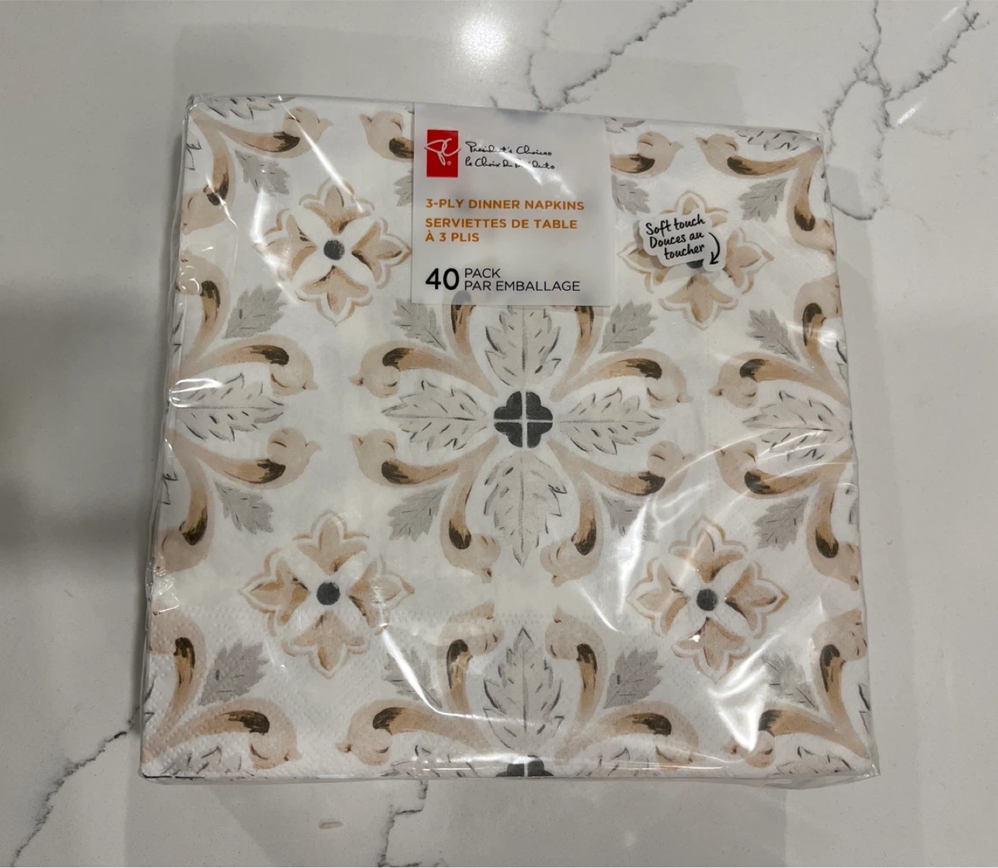 Selling a pack of PC 3-ply dinner napkins. There are 40 napkins in the pack. They have a soft touch and a pretty floral design- perfect for hosting and parties!