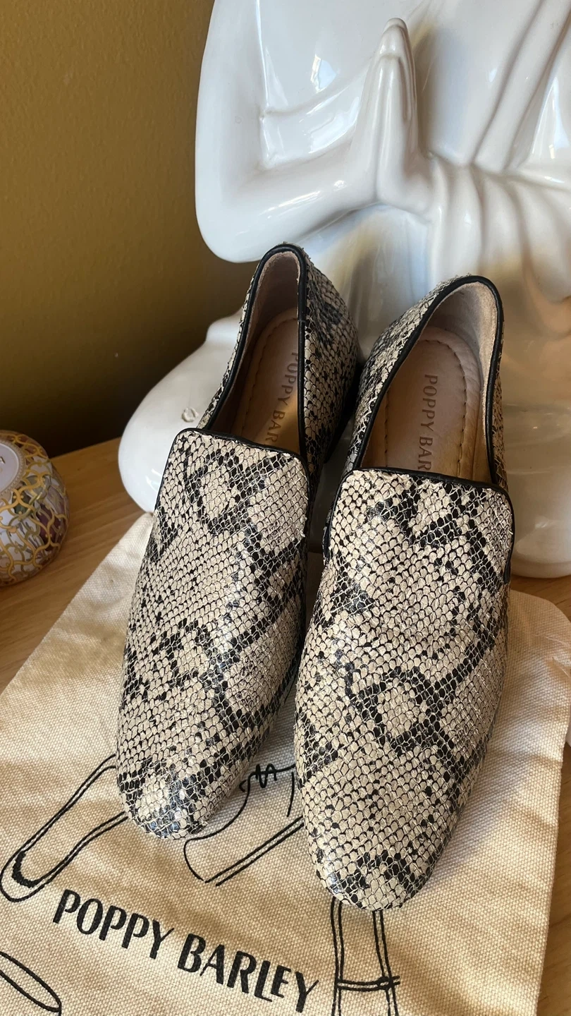 Poppy Barley snakeskin print leather loafers, a chic and comfortable addition to any wardrobe. These shoes are new never worn.
