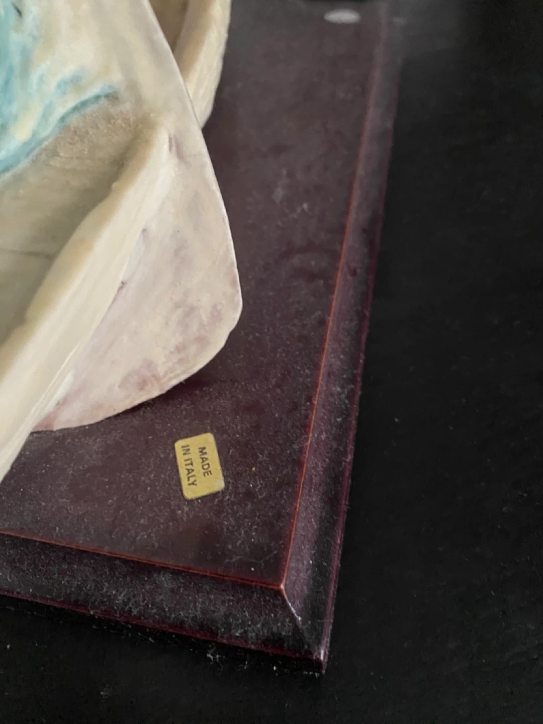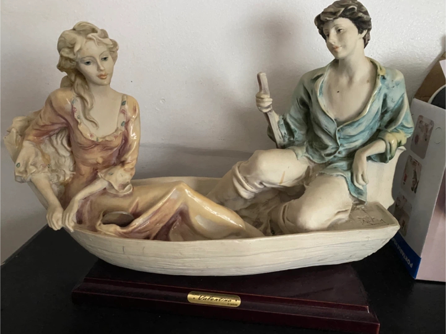 This beautiful Serie Valentino figurine by Miriam is a charming addition to any home decor collection. It features a detailed scene with figures in a boat, mounted on a wooden base. The figurine is in great condition and ready to be displayed!