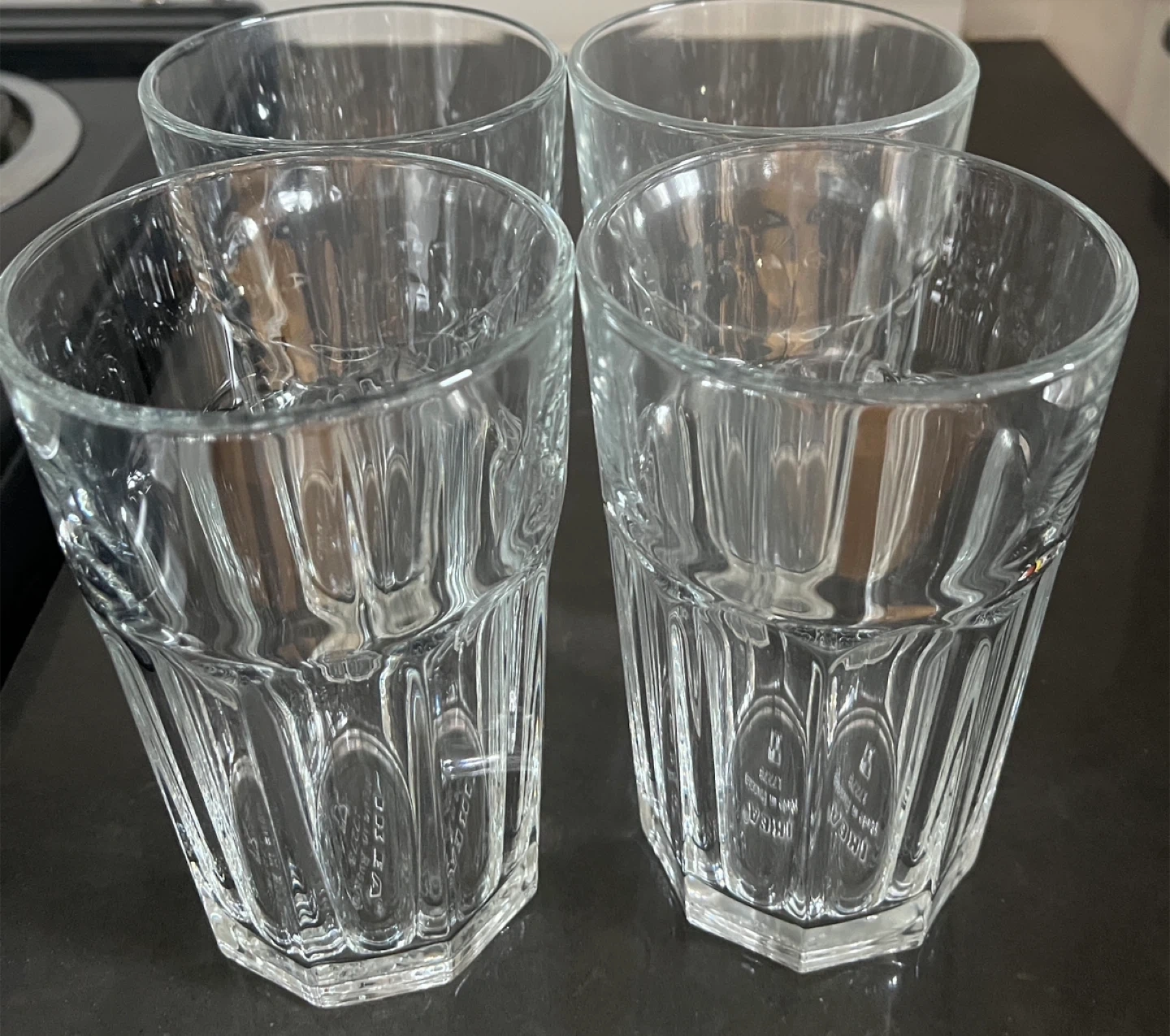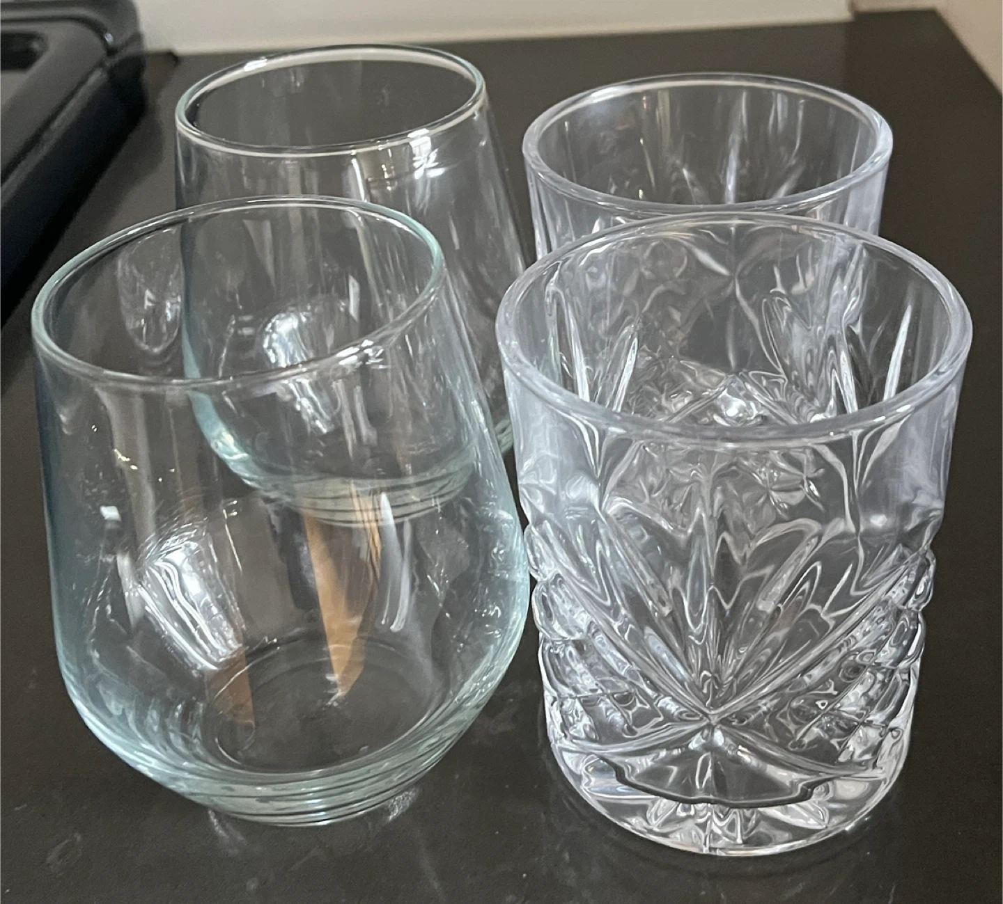 Selling a set of four assorted glasses. There are a variety of styles, perfect for different drinks or occasions. They're all new and ready to use!