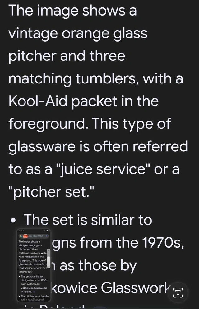 Add a touch of vintage charm to your table with this delightful orange glass pitcher and tumbler set! Perfect for serving up refreshing beverages, this set includes a pitcher and three matching tumblers. The pitcher is in great condition, ready to pour your favourite drinks. The tumblers are also in excellent shape, with a vibrant orange hue that catches the eye. This is a used set. * Set includes: 1 pitcher, 3 tumblers * Colour: Orange Looking for a unique addition to your glassware collection? This set is sure to please! If the ad is still up, the set is still available!