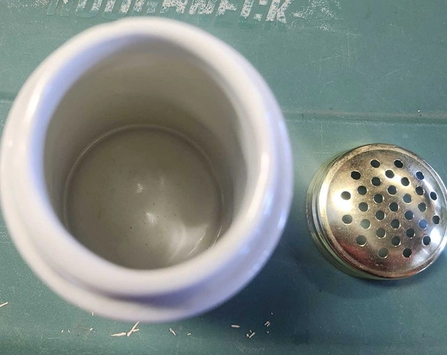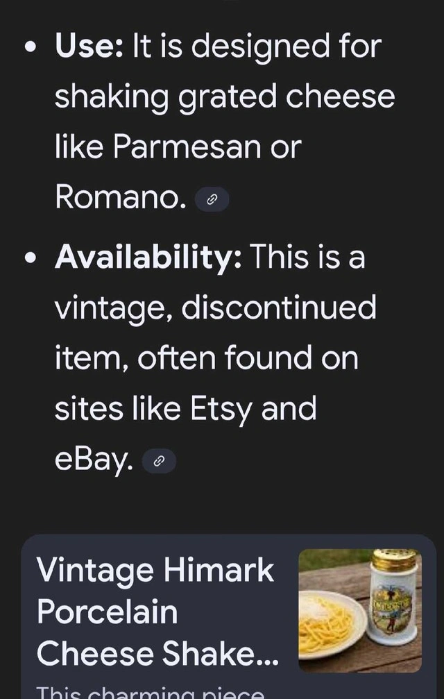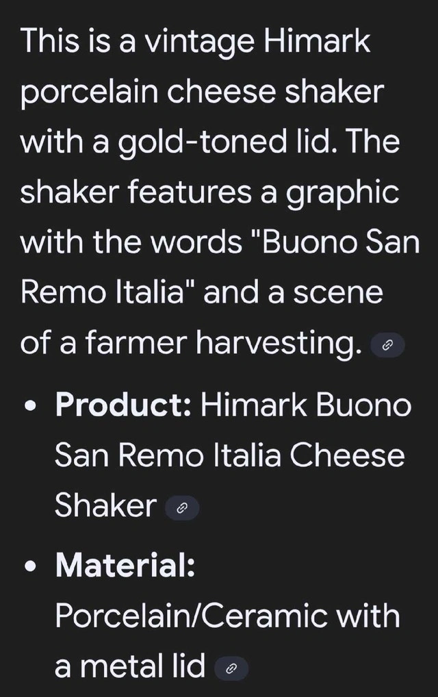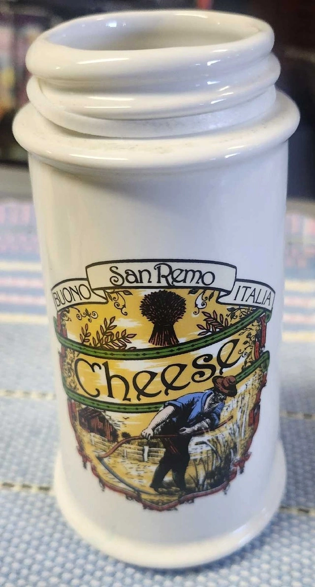 Add a touch of Italian charm to your table with this vintage HIMARK cheese shaker! Featuring a delightful San Remo Italia design, this shaker is perfect for sprinkling parmesan over your favourite pasta. Please note, this is a used item, adding to its nostalgic appeal. This whimsical shaker is looking for a new home – maybe yours? And just so you know, if you're seeing this ad, it means it's still available!