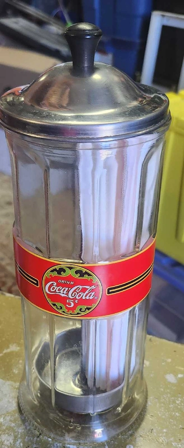 Here we have a vintage looking Coca-Cola straw dispenser, perfect for adding a touch of nostalgia to your kitchen or collection. This dispenser is in good condition, showing some signs of wear that add to its vintage charm. This unique piece is sure to be a conversation starter and a great addition to any Coca-Cola memorabilia collection.