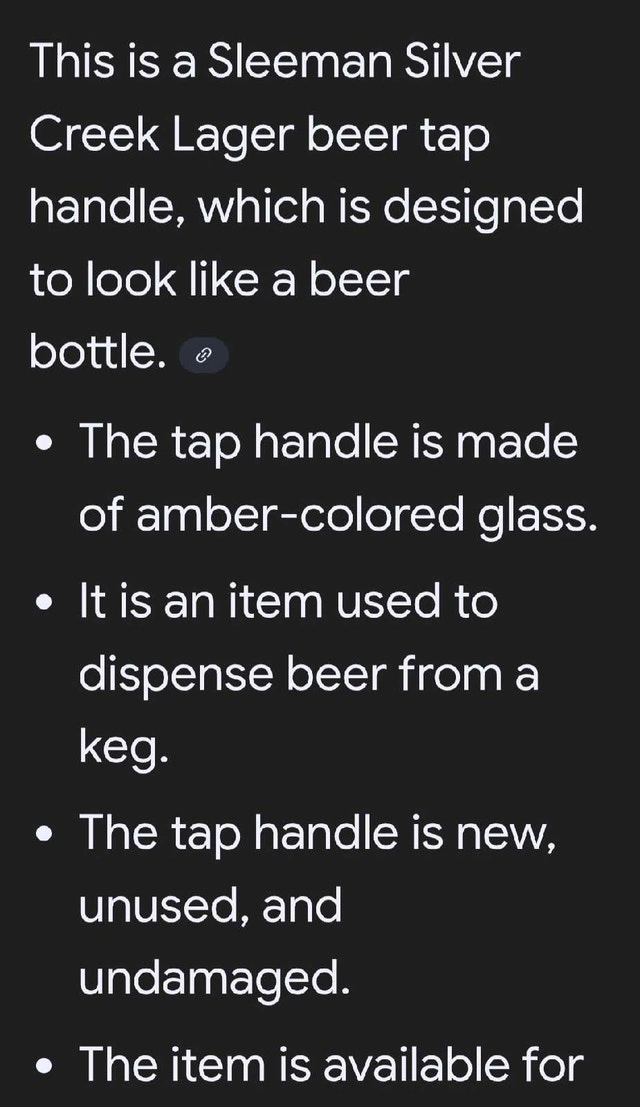 This is a Sleeman Silver Creek Lager beer tap handle, which is designed to look like a beer bottle. This item is new, unused, and undamaged. Whether you're a collector of brewery memorabilia or just like unique bar accessories, this tap handle is sure to be a conversation starter. I've priced it to sell, so grab it before it's gone! If the ad is still up, yes, it's still available.