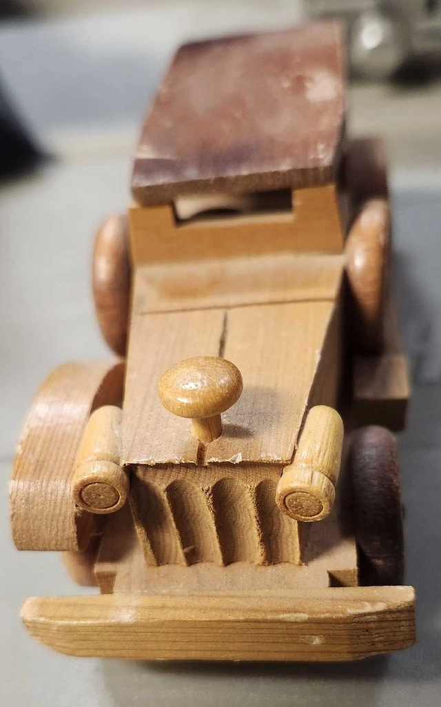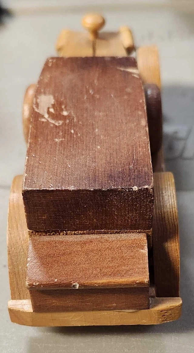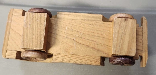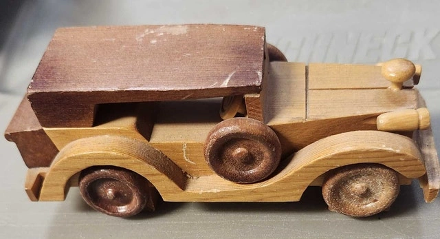 This vintage-style wooden toy car is a charming decorative piece, handcrafted from natural wood with a two-tone finish. Showing some signs of wear, this toy exudes a nostalgic appeal, perfect for collectors or as a unique accent in a child's room. * Material: Wood * Style: Vintage * Colour: Two-Tone Brown