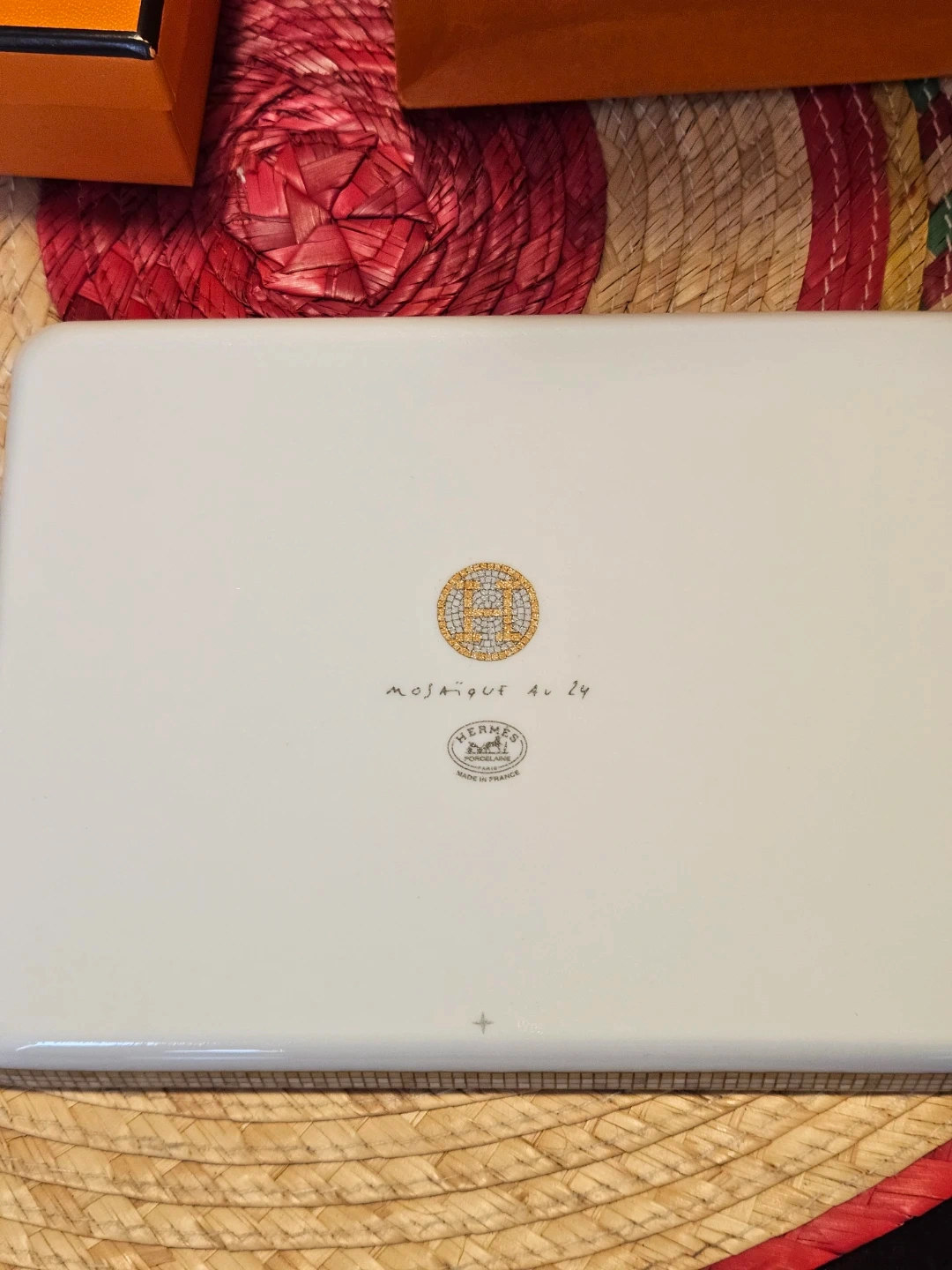 Selling a brand new Hermès Mosaique Au 24 tray! It comes with the original box and packaging. This elegant tray features a beautiful mosaic design. Perfect for adding a touch of luxury to your home decor https://www.hermes.com/ca/en/product/mosaique-au-24-platinum-tray-small-model-P035089P/
