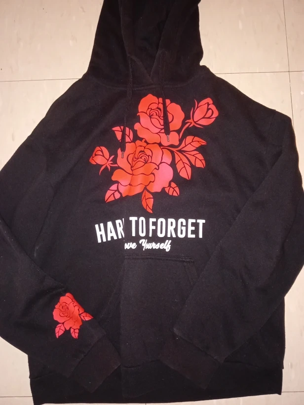 Selling a black Amnesia hoodie with a floral design. The hoodie features the words "Hard to Forget" on the front and "Easy to Love" on the back. It's in great condition and ready for a new owner!