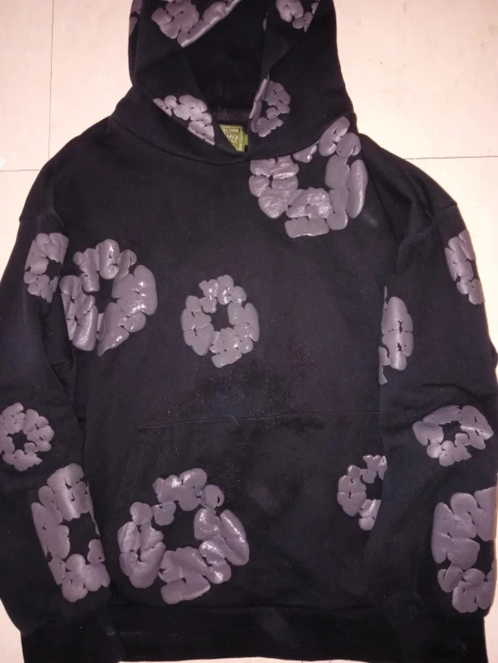 Selling a black hoodie from Denim Tears. The hoodie has a unique design with grey floral patterns. The material is 100% cotton and it is made in the USA. It's in great condition and ready for a new owner!