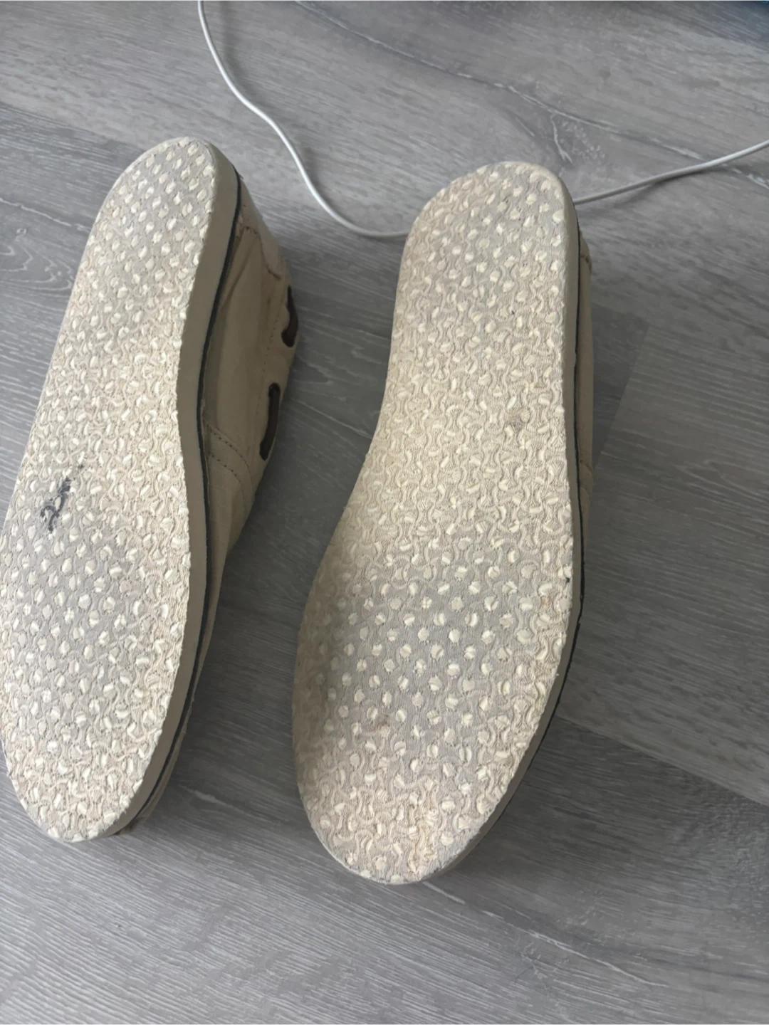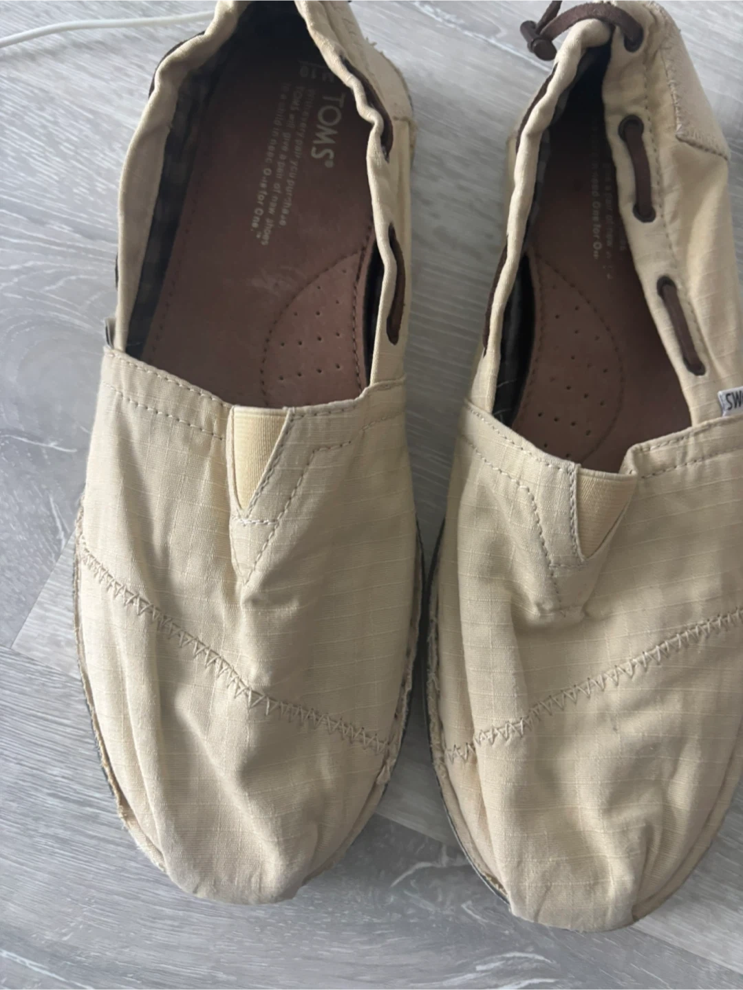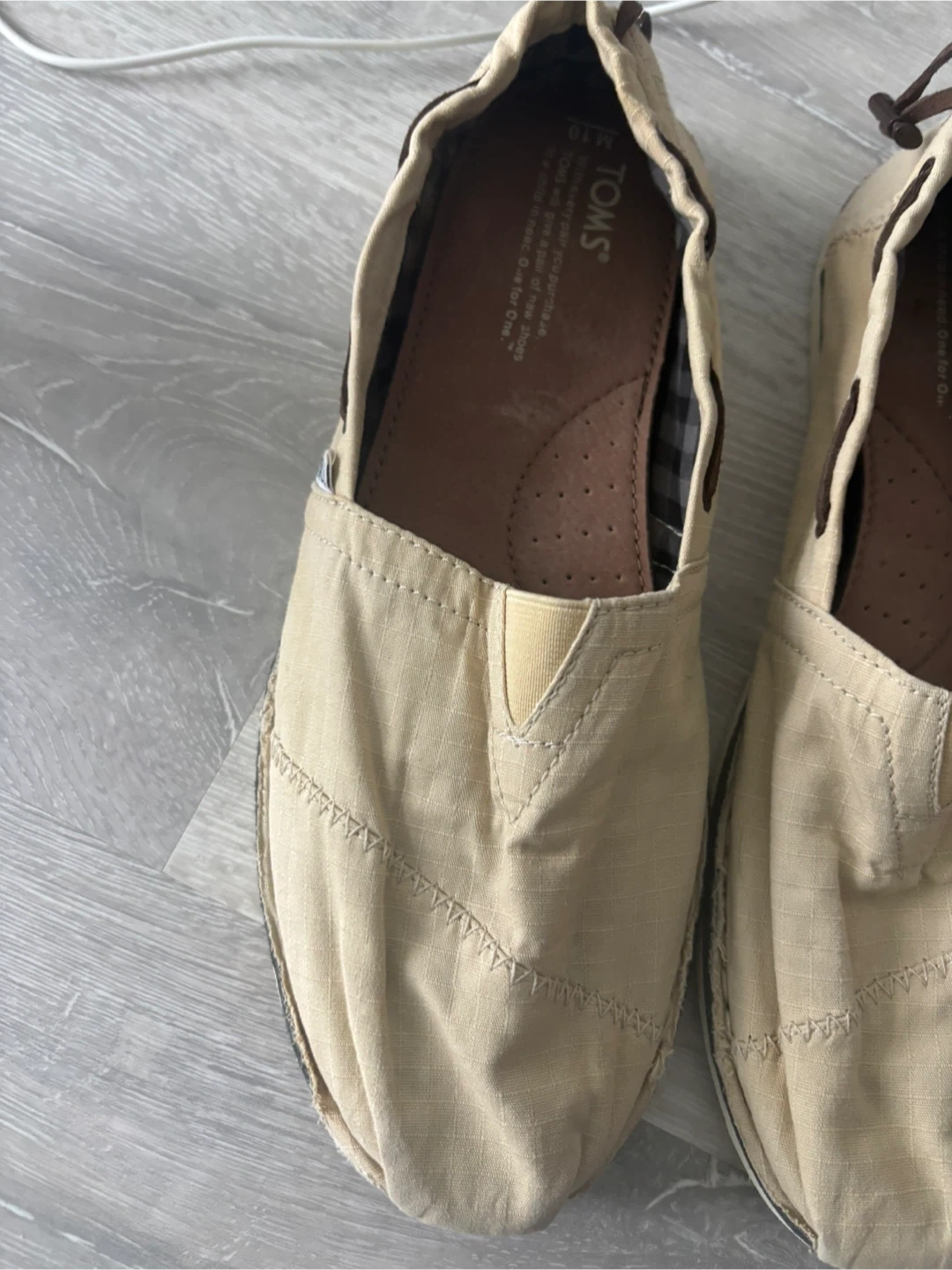 Selling a pair of TOMS slip-on shoes in a size 10 M They are beige and show some signs of wear, as you can see in the photos. Still lots of life left in them!