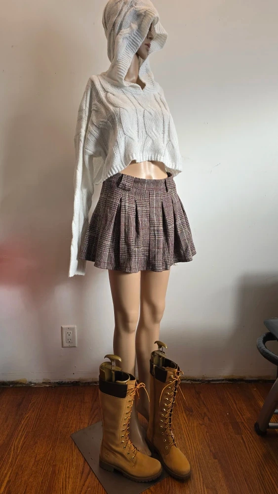 This is a cute plaid mini skirt. $25 It's in new condition and would be a great addition to your wardrobe! Oversized gently used crop knit hoodie xs- xl $30 Will look even more amazing if you actually own an iron and press the pleats unfortunately I I'm not Martha Stewart I don't own an iron main reason for selling love the look 😆Brand new Knee high Timberland boots $199.00 sz 6us 4uk