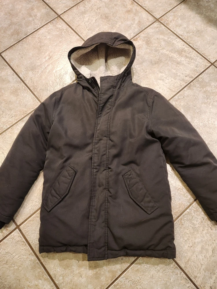 Selling a cozy Old Navy winter jacket for kids! It's a size L (10-12). The jacket is Grey on the outside and has a red and black buffalo plaid lining. Perfect for keeping warm this winter.