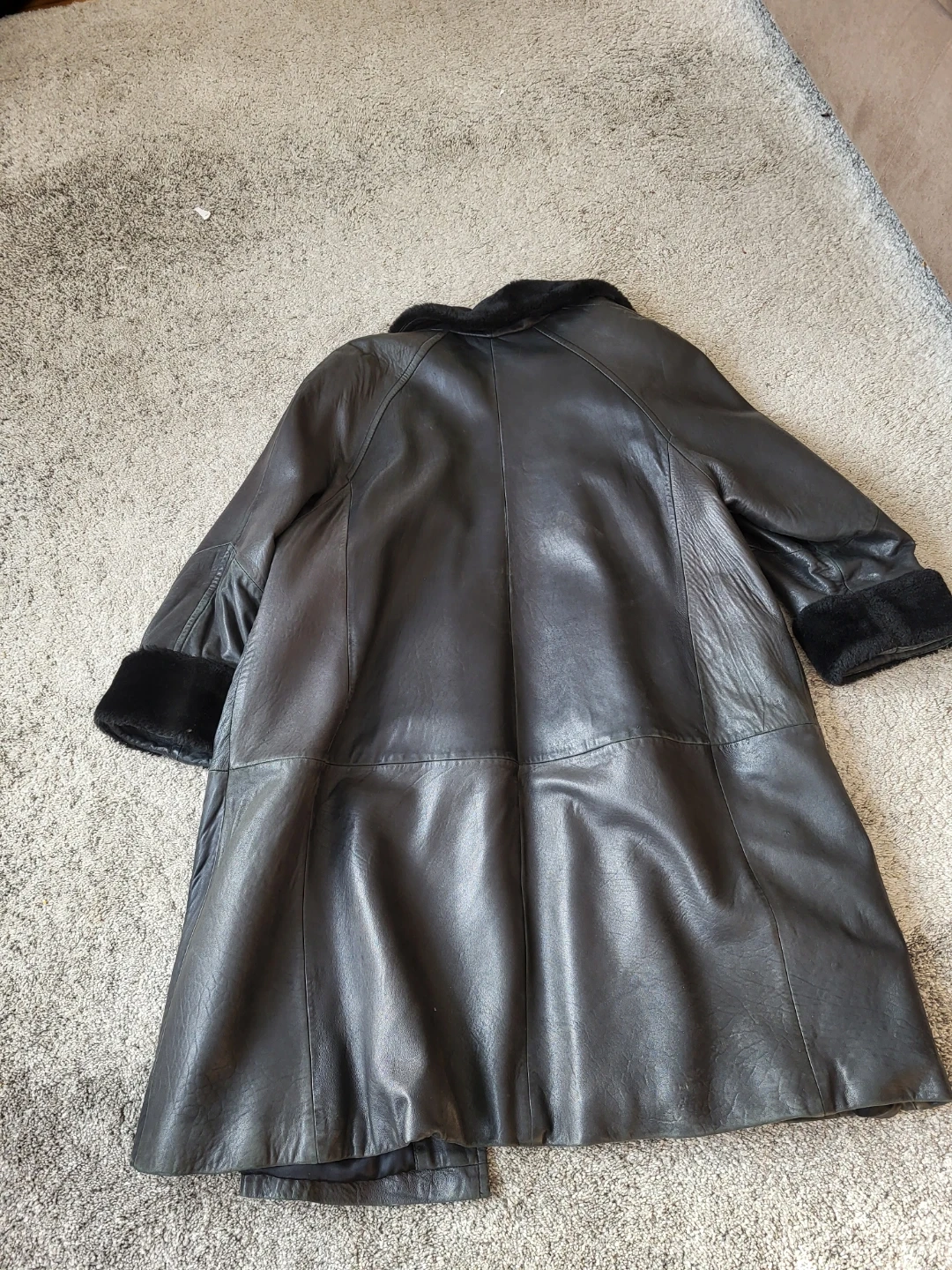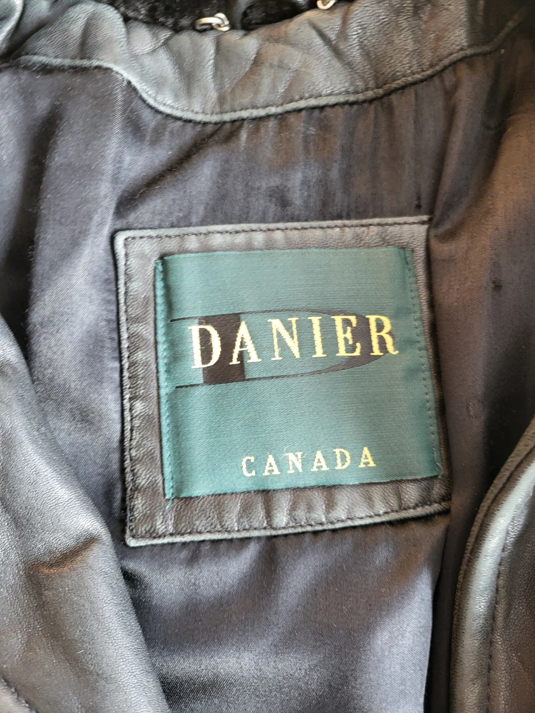 Selling a stylish black leather coat from Danier Canada! It's a size L and features a classic design with fur trim. Perfect for keeping warm during the colder months!