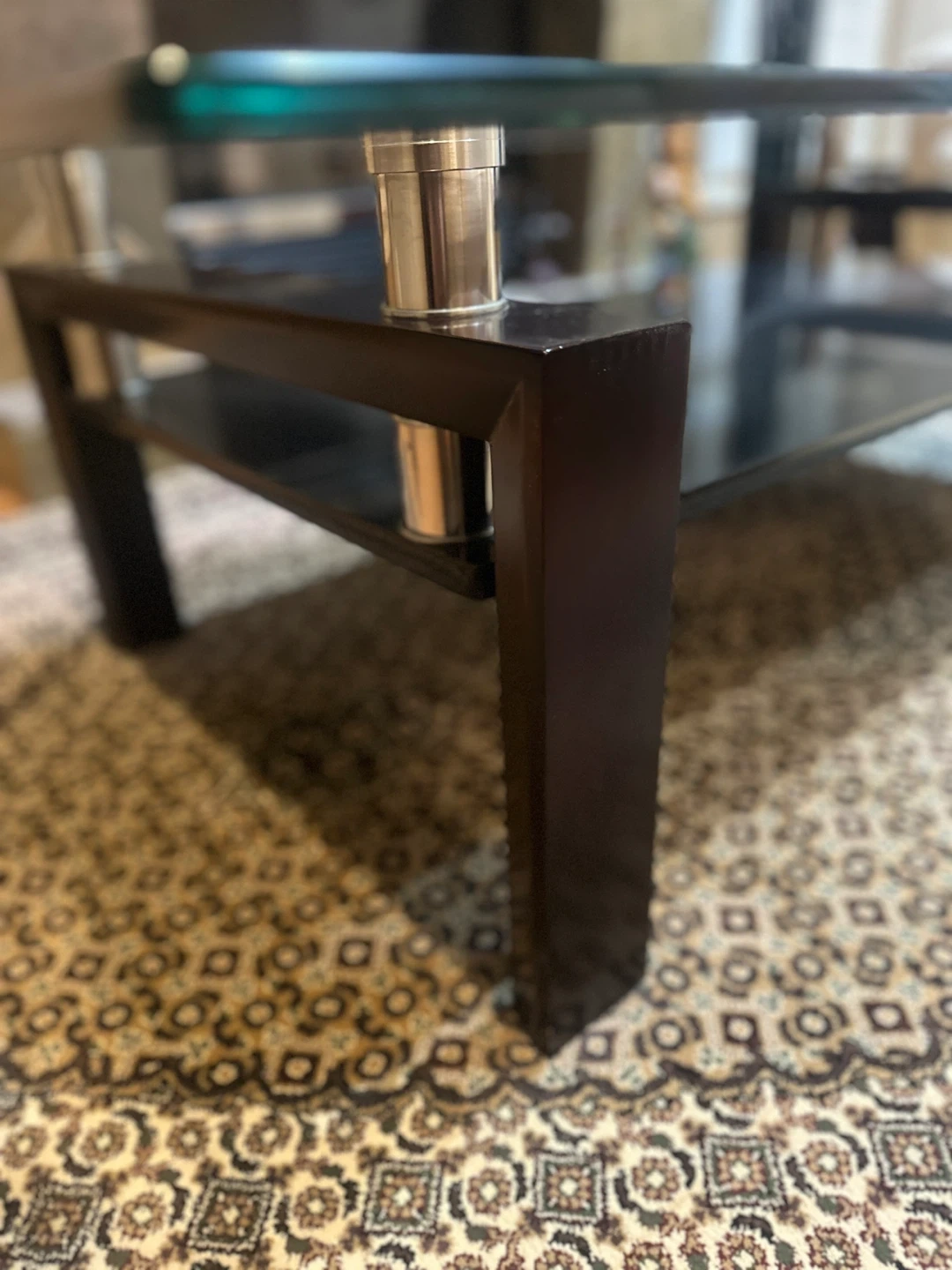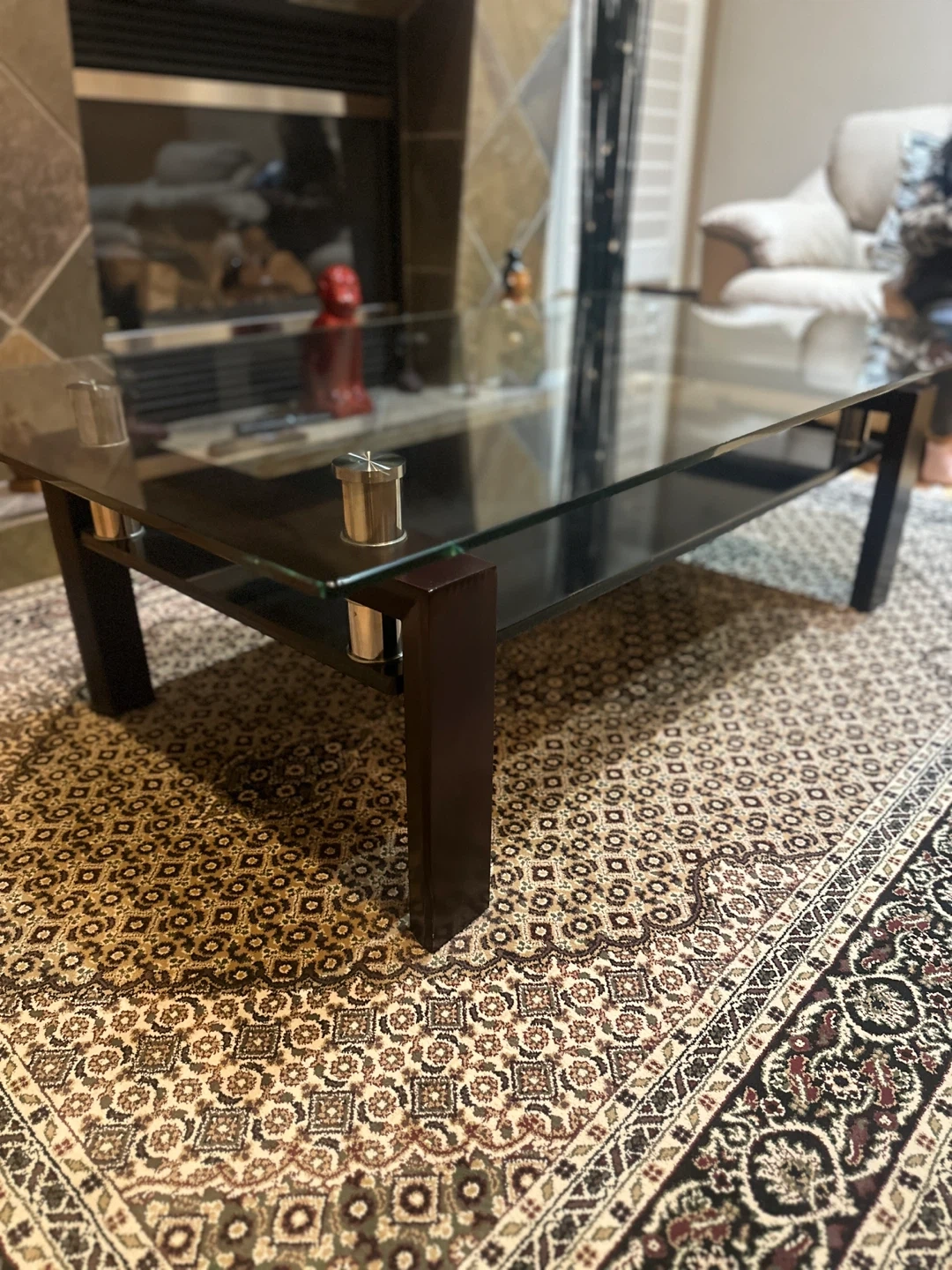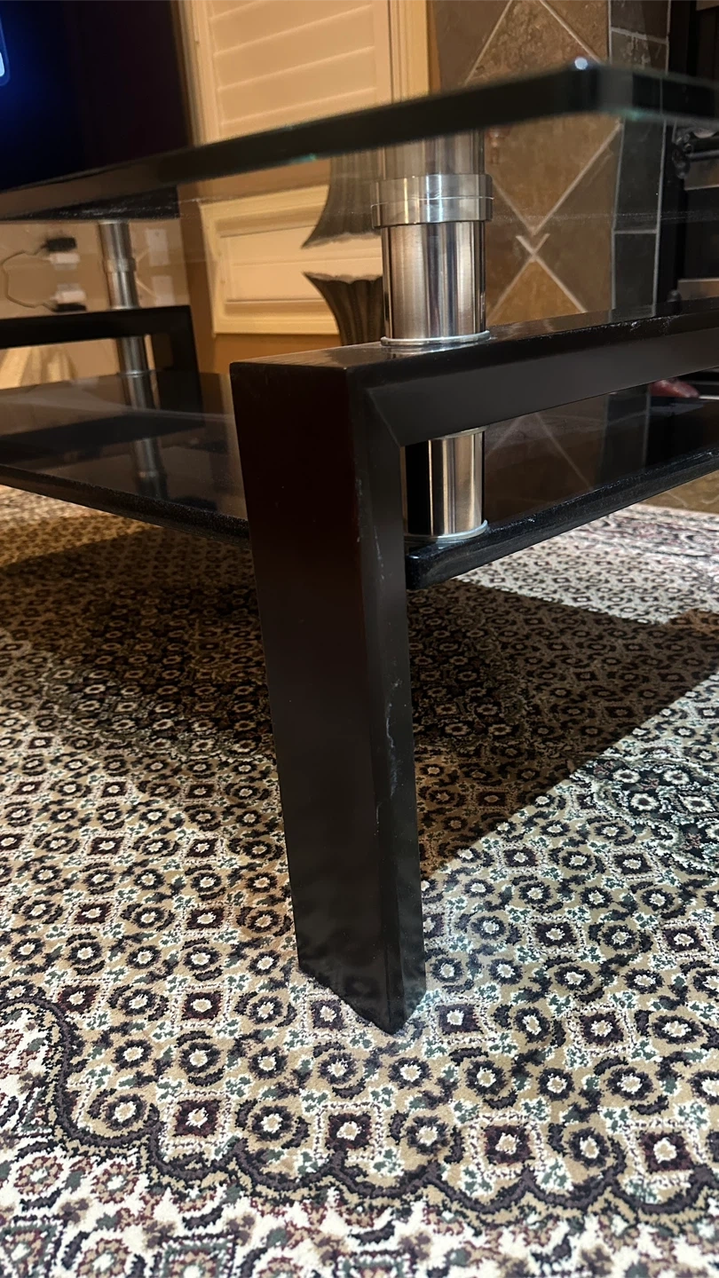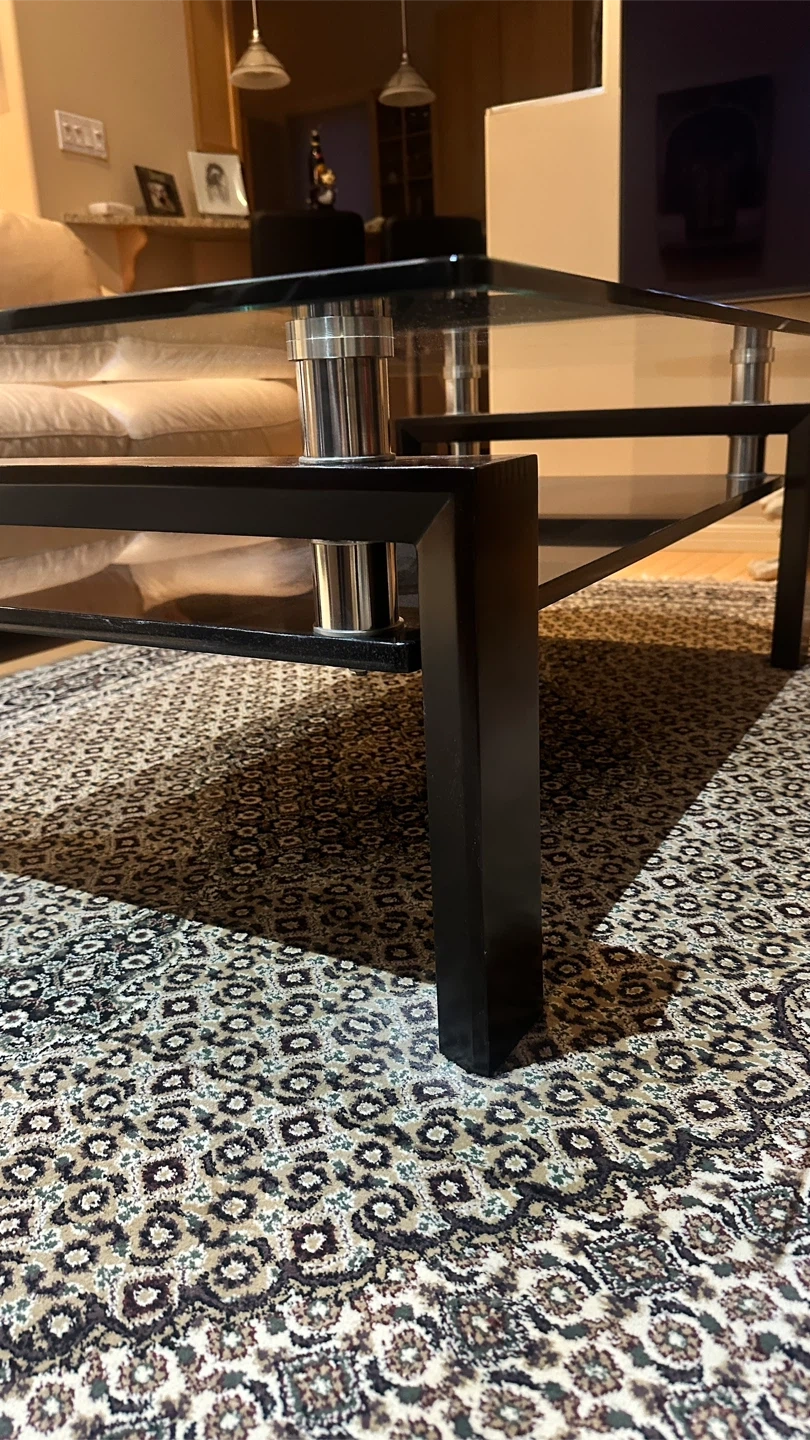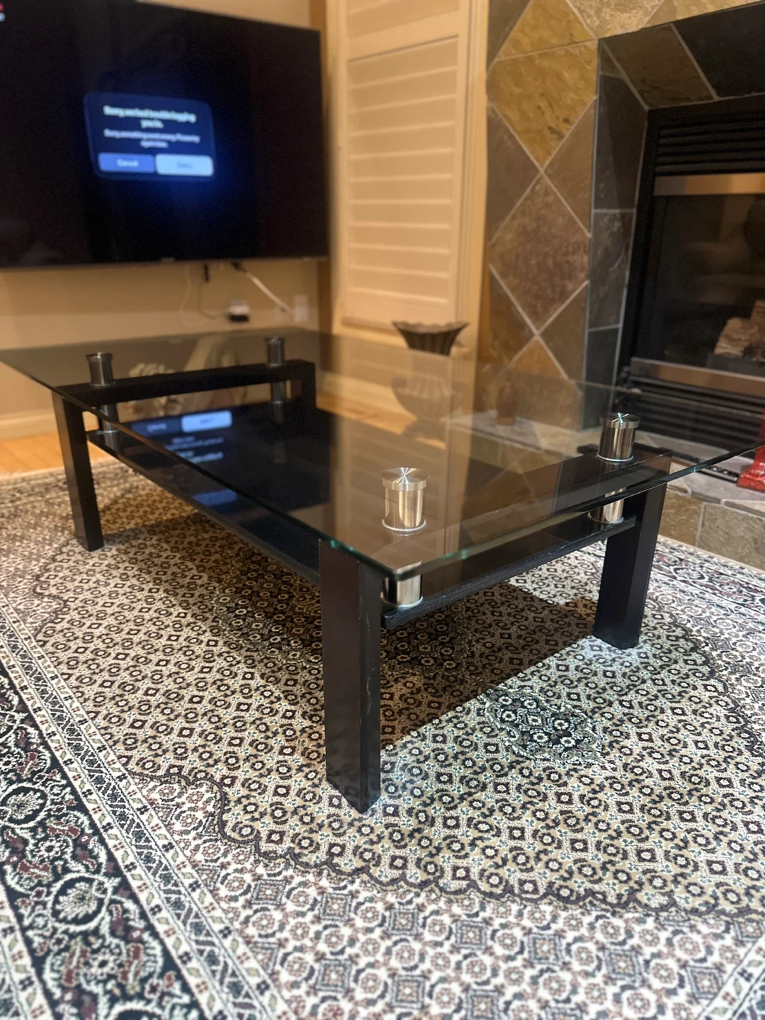 Selling a coffee table with a glass top and a black frame. It's in good condition and would look great in any living room! The table has a modern design with silver accents on the legs. It also features a lower granite shelf for extra storage or decor