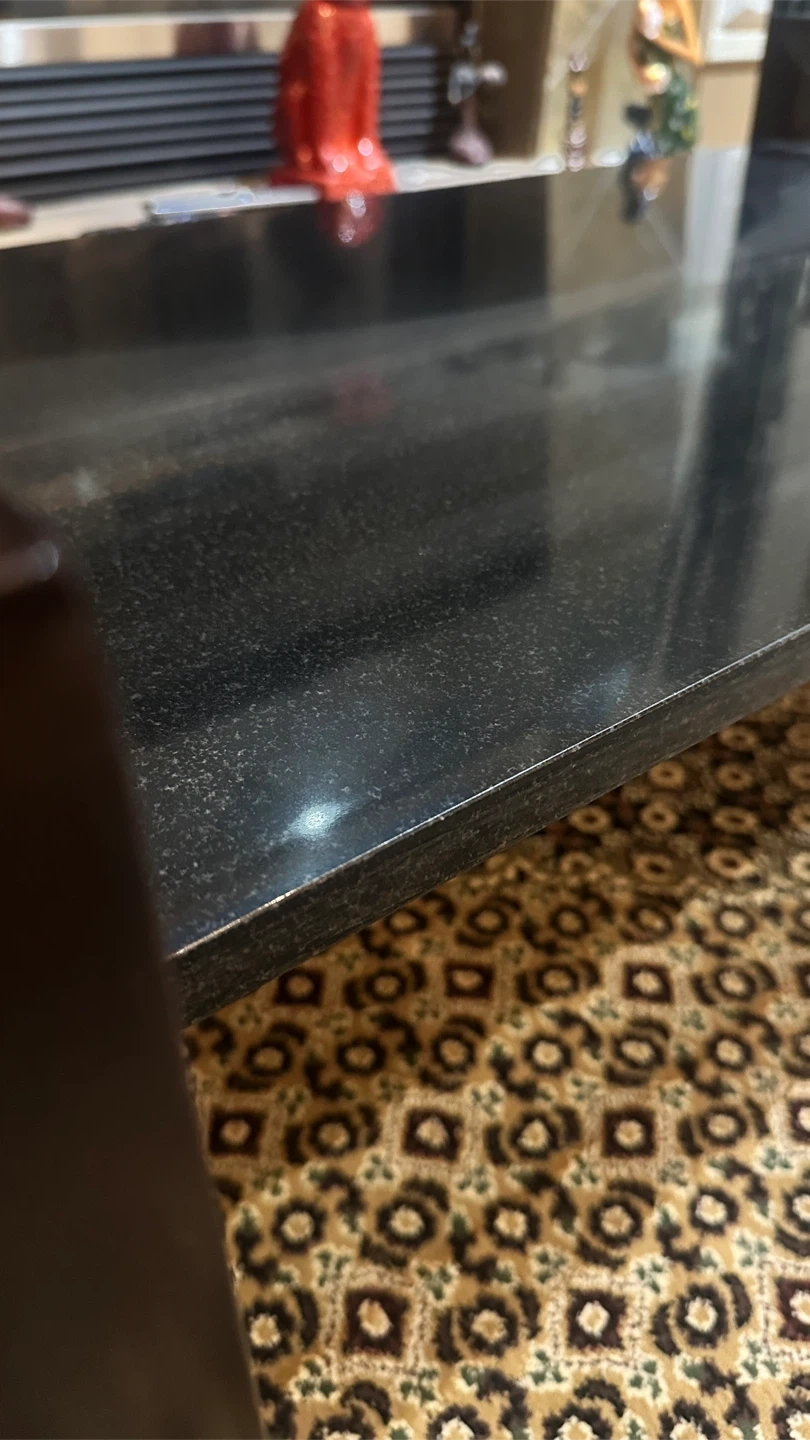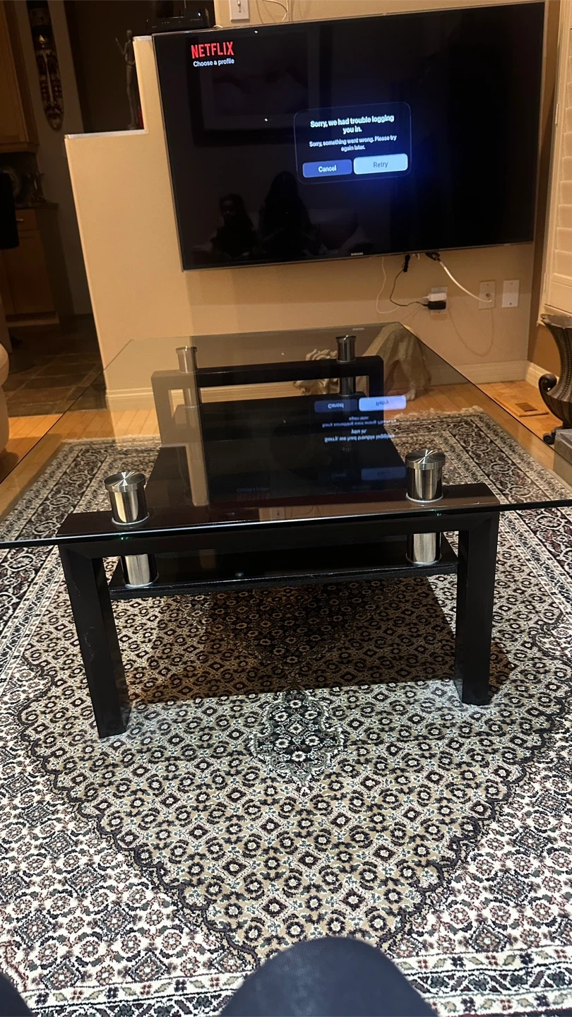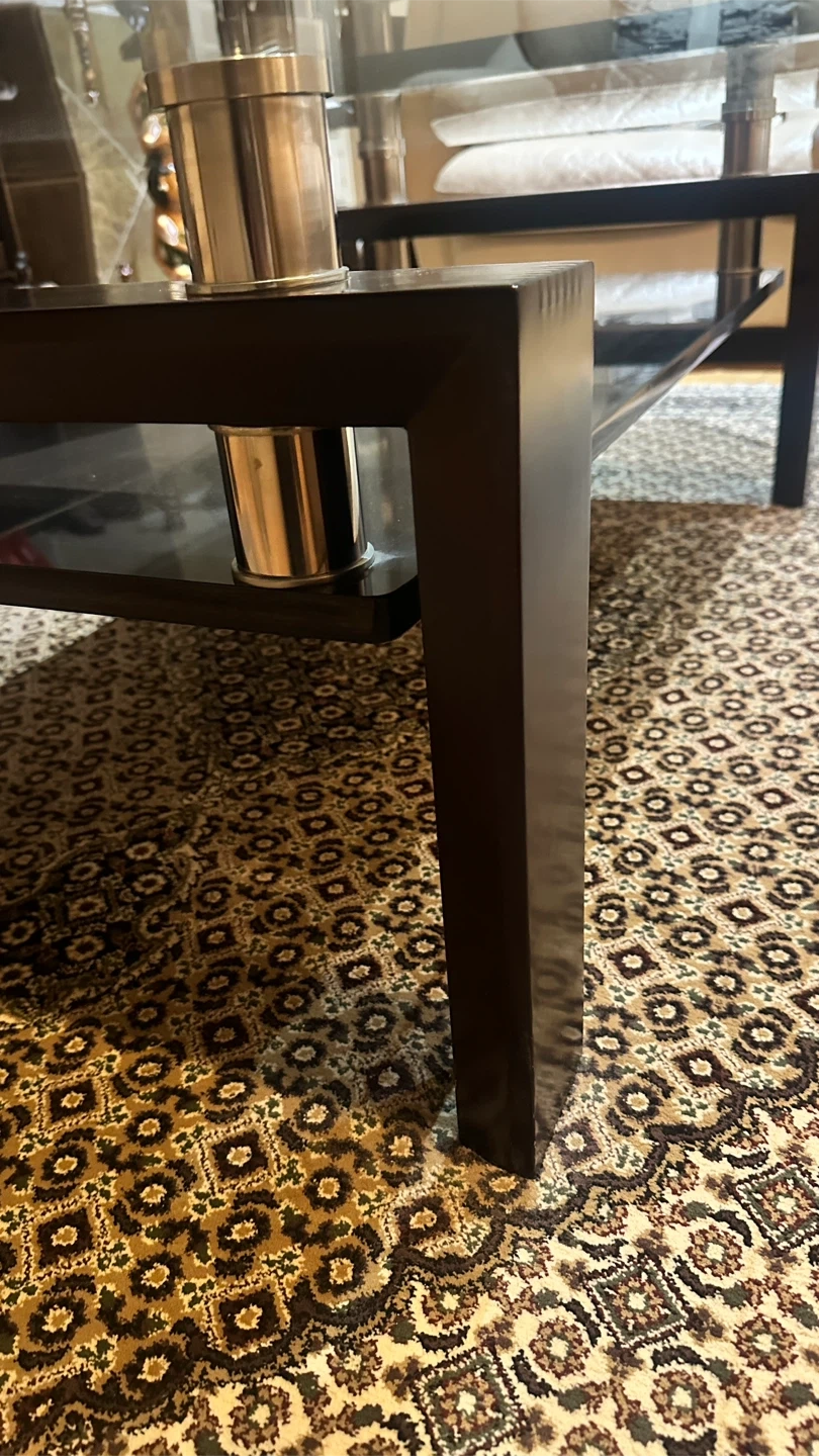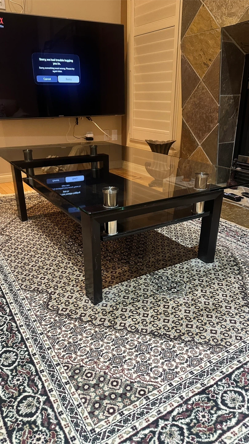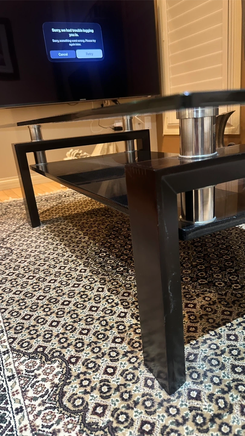Selling a coffee table with a glass top and a black frame. It's in good condition and would look great in any living room! The table has a modern design with silver accents on the legs. It also features a lower granite shelf for extra storage or decor