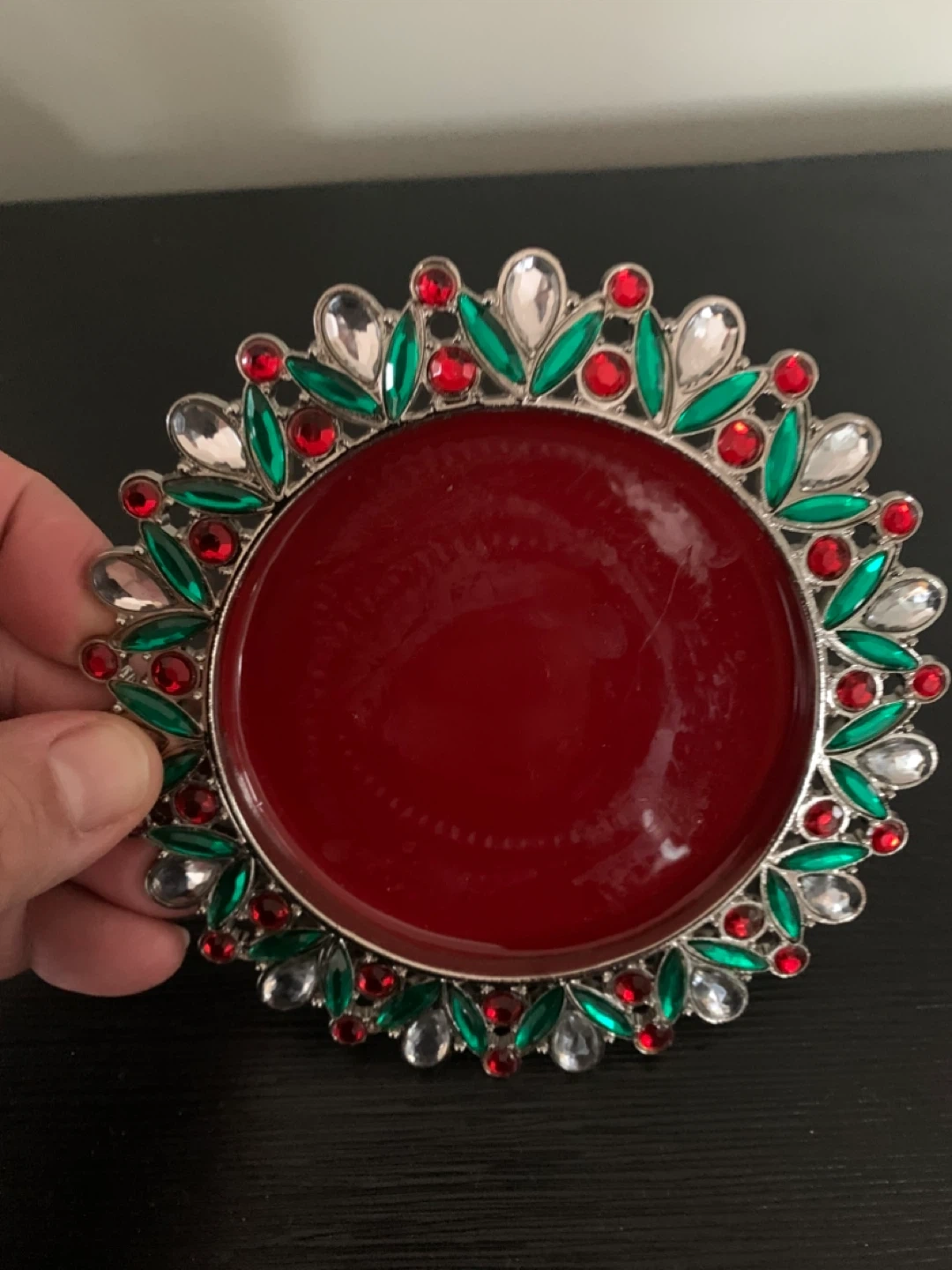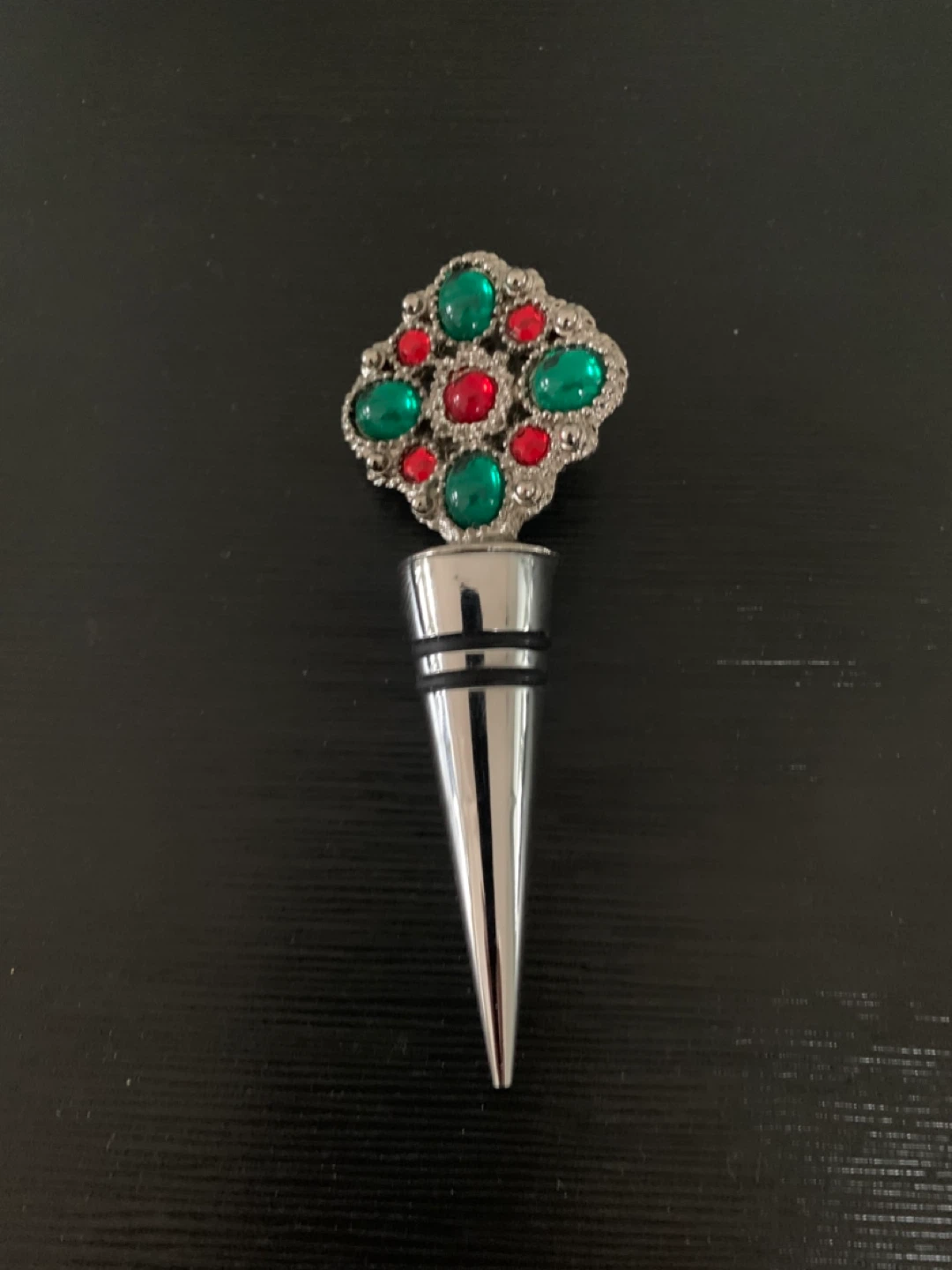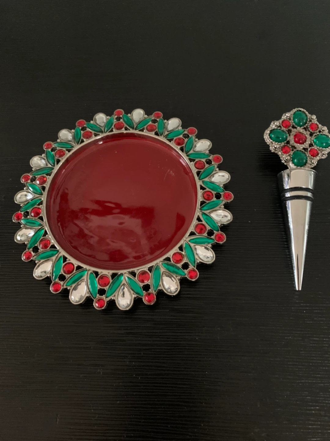 PRICE DROP! Here's a charming decorative set! It includes a red coaster with a festive trim of red, green, and clear gems, and a matching bottle stopper with similar gem accents. Perfect for adding a touch of sparkle to your home decor or next gathering