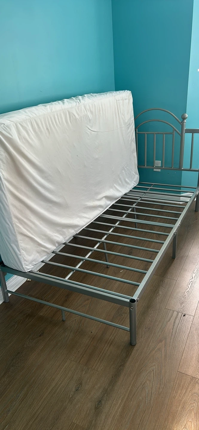 Buy & SellSilver Metal Twin Bed Frame and mattressesSilver Metal Twin Bed Frame and mattresses$80Selling a twin-size bed frame in silver metal! It's in good condition with mattress. Perfect for a bedroom or guest room IKEA mattresses twin sizeConditionGoodWHERE TO MEET2 Telstar Way WhitbyView MapSELLERverifiedRasangSilverstone681 review1 chats·0 favorites·6 views