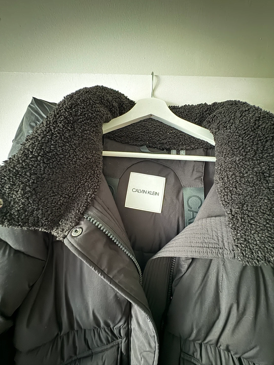 Selling a Calvin Klein puffer jacket in black. It's in great condition and a size medium. Perfect for staying warm this winter!