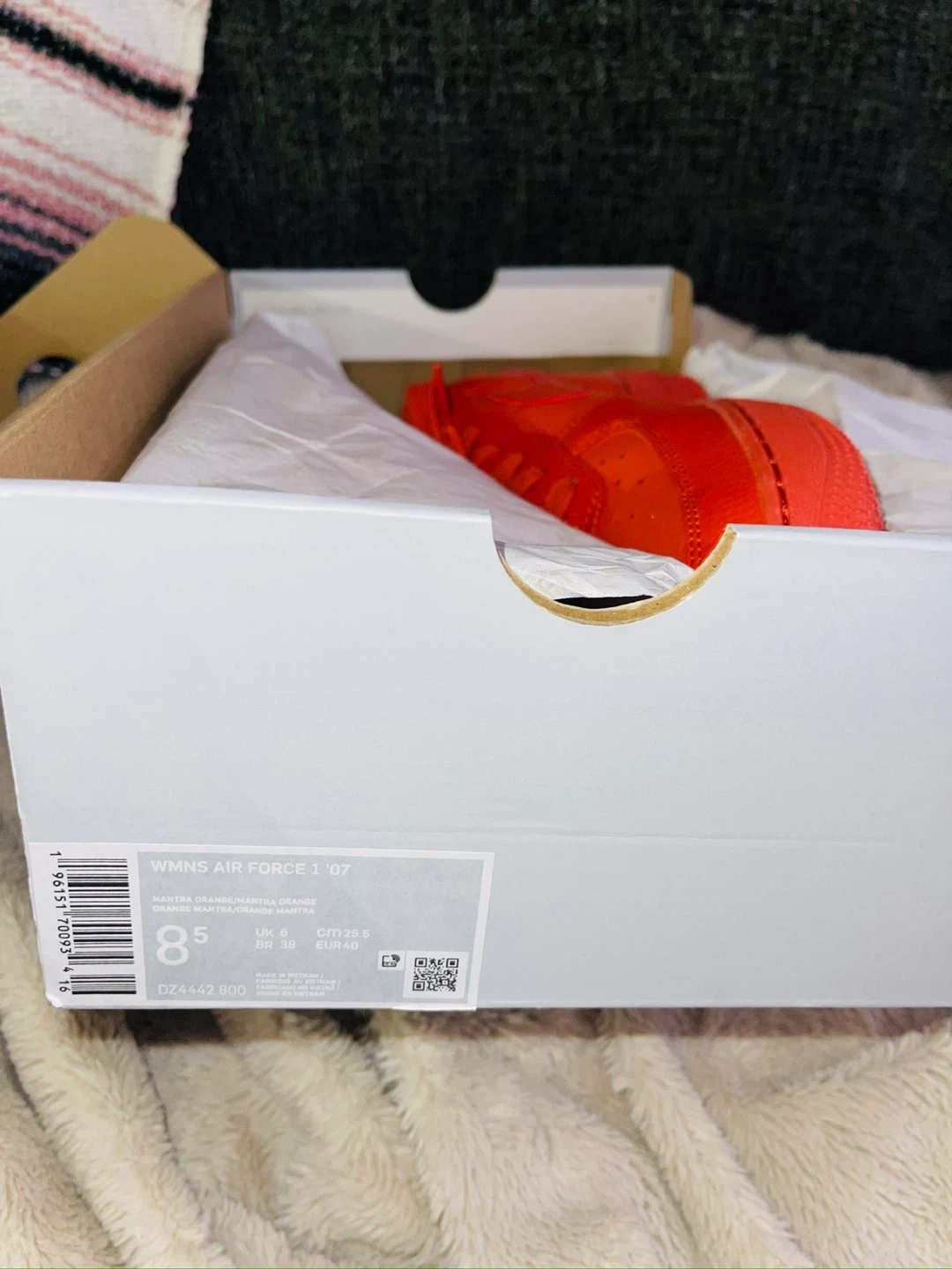 Selling a pair of Nike Air Force 1 '07 in Triple Orange, women's size 8.5! These shoes come with the original box.