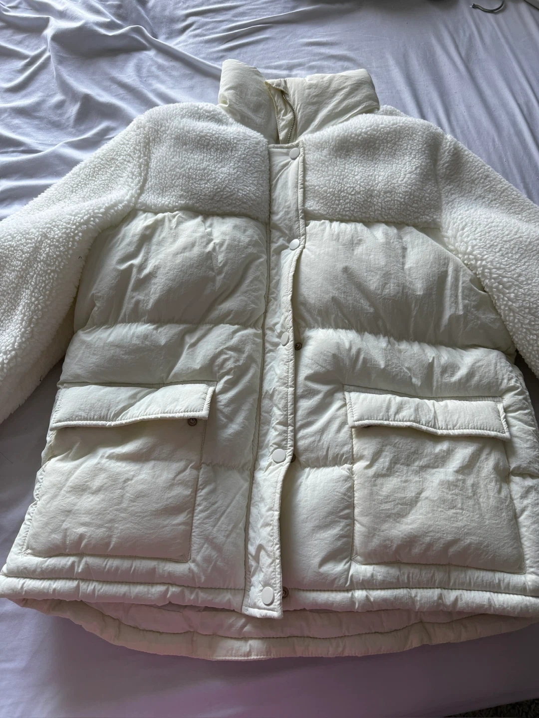 Selling a comfy white puffer jacket! It has a unique design with sherpa detailing on the shoulders and upper chest area. It's in great condition and perfect for staying warm during the colder months. It features a button-up closure and functional pockets