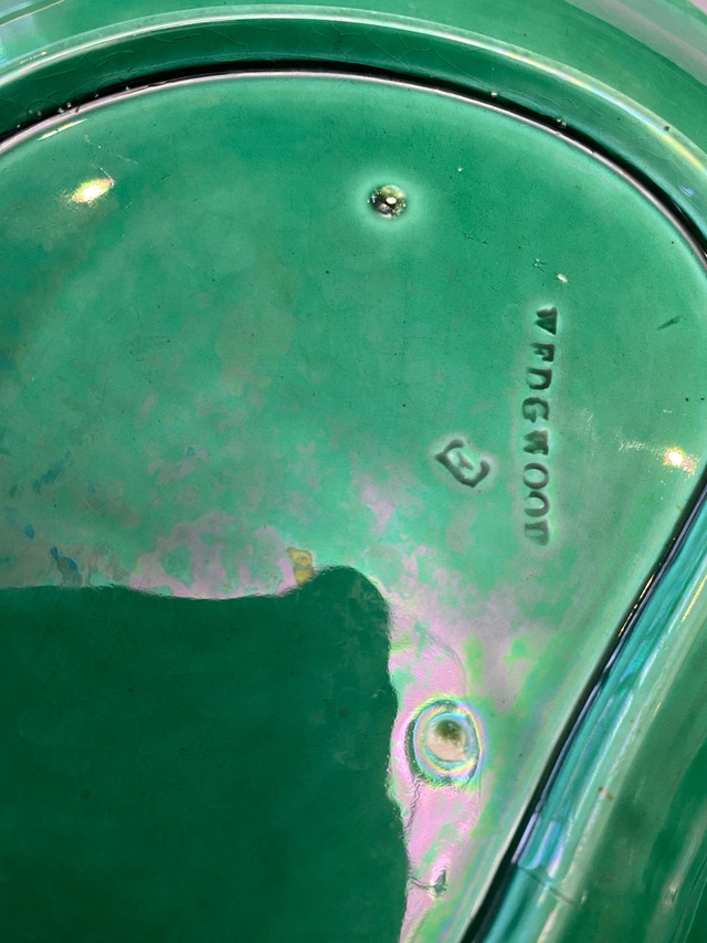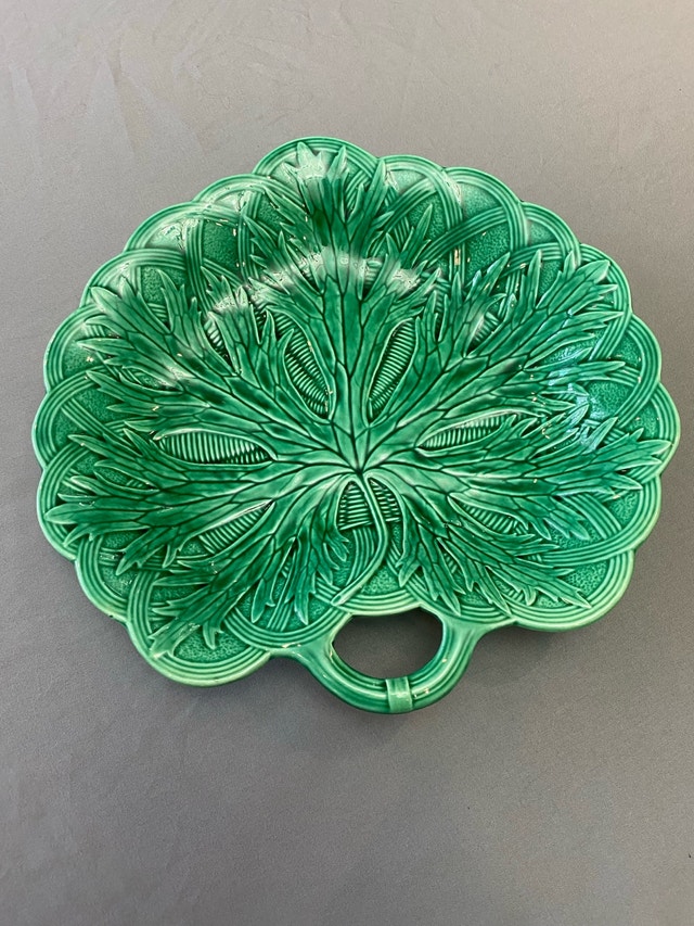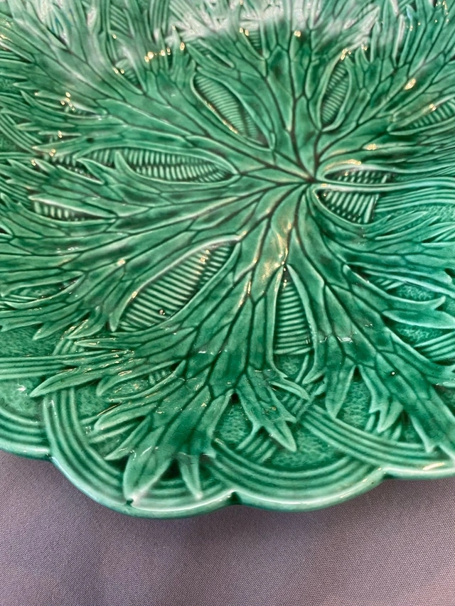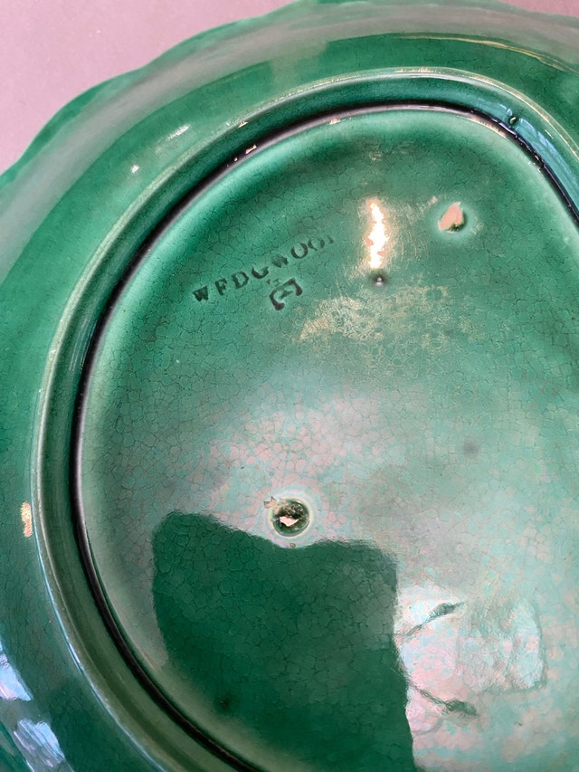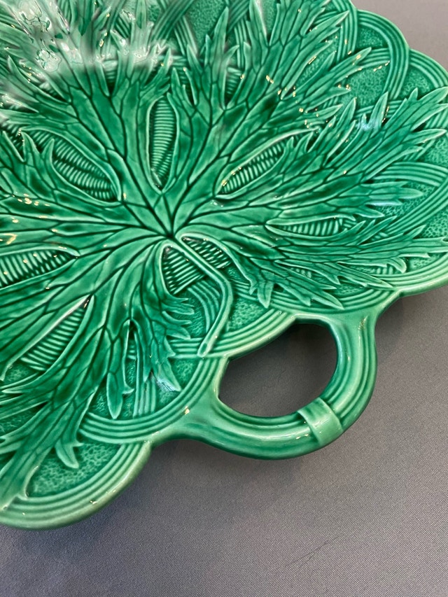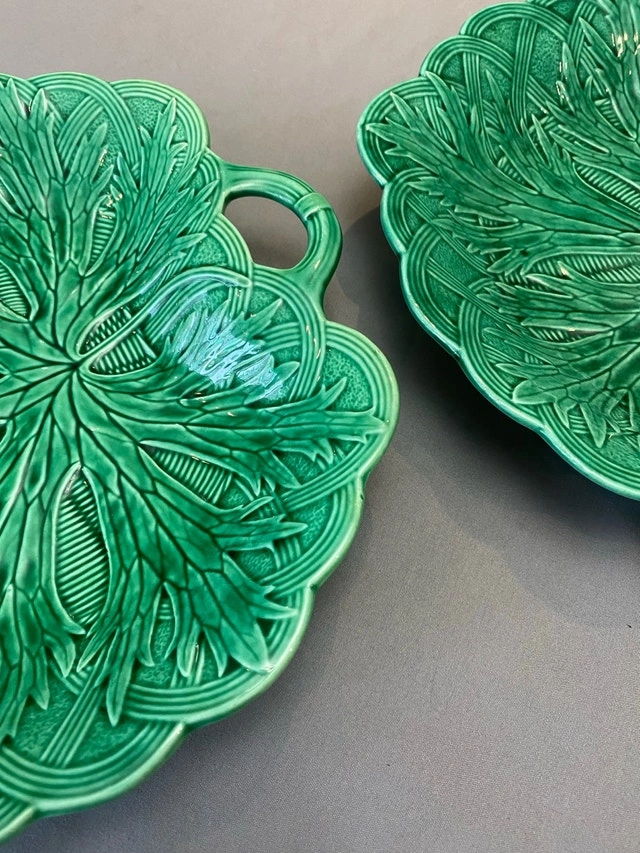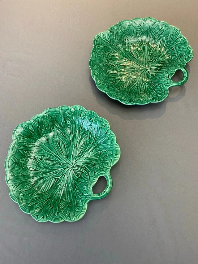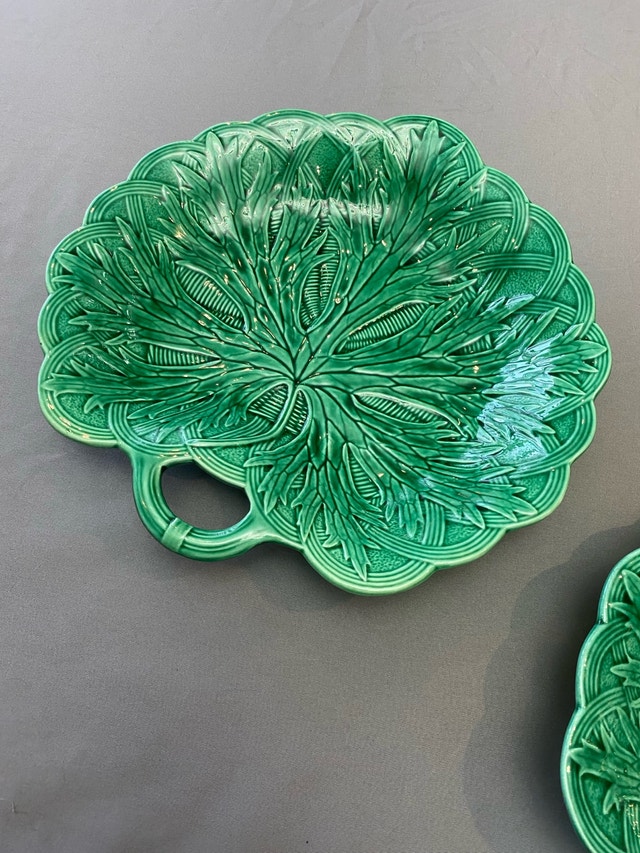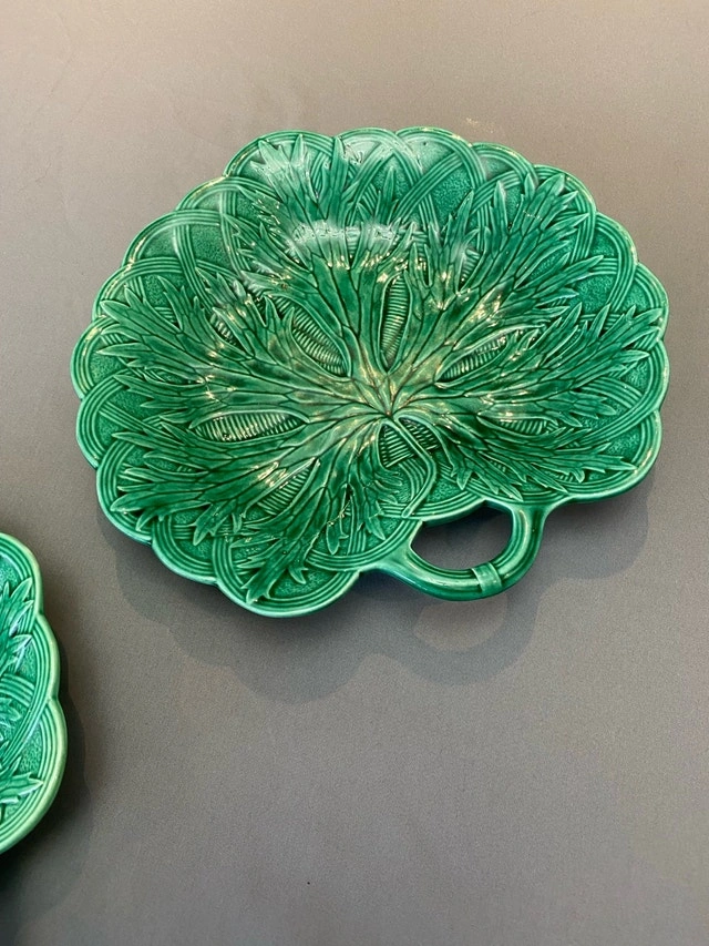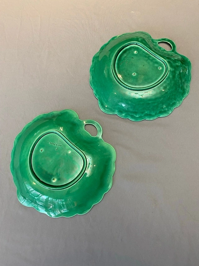 Add a touch of antique elegance to your table with these stunning green Wedgwood Majolica leaf dishes. These beautiful dishes feature intricate leaf detailing and a vibrant, glossy green glaze. Perfect for serving appetizers, desserts, or as decorative pieces. They are in excellent condition, with no chip, cracks. * Brand: Wedgwood * Pattern: Majolica * Material: Ceramic * Colour: Green * Diameter: 8 inches