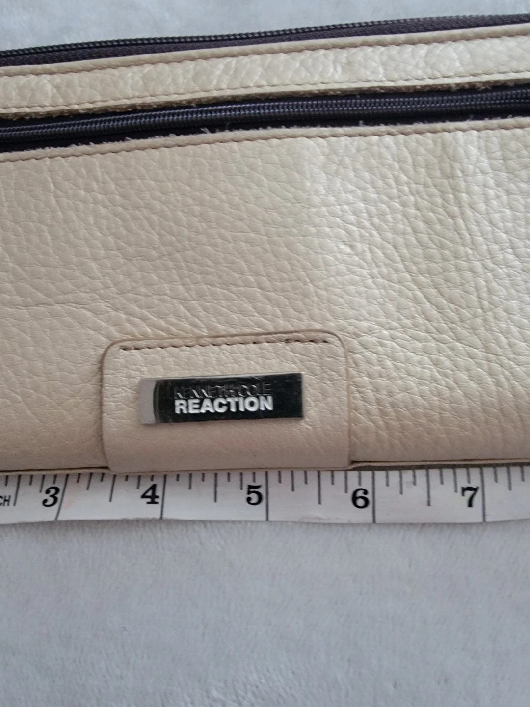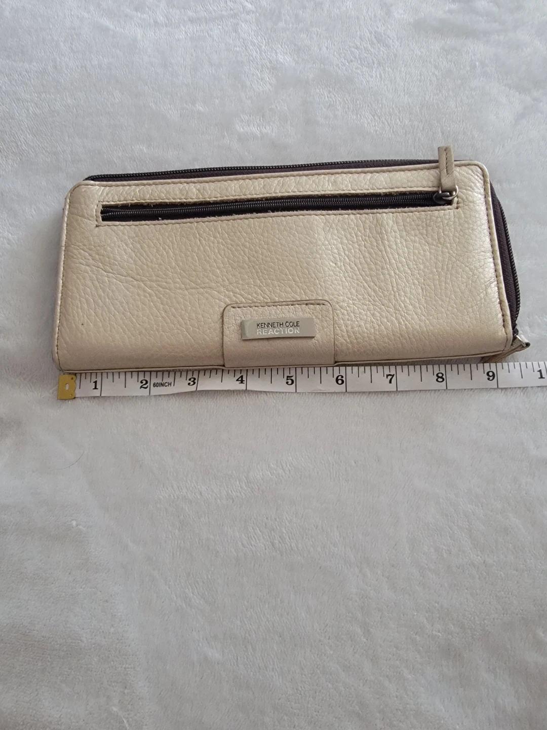 Selling a Kenneth Cole Reaction wallet in good condition. It's a light beige colour and measures approximately 9 inches in length. Perfect for keeping your essentials organized!