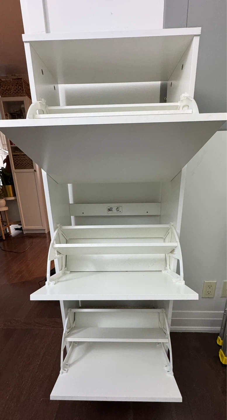Selling a white IKEA shoe cabinet. Organise your entryway or closet! It has three compartments for storing shoes and keeping them out of sight. Perfect for small spaces!
