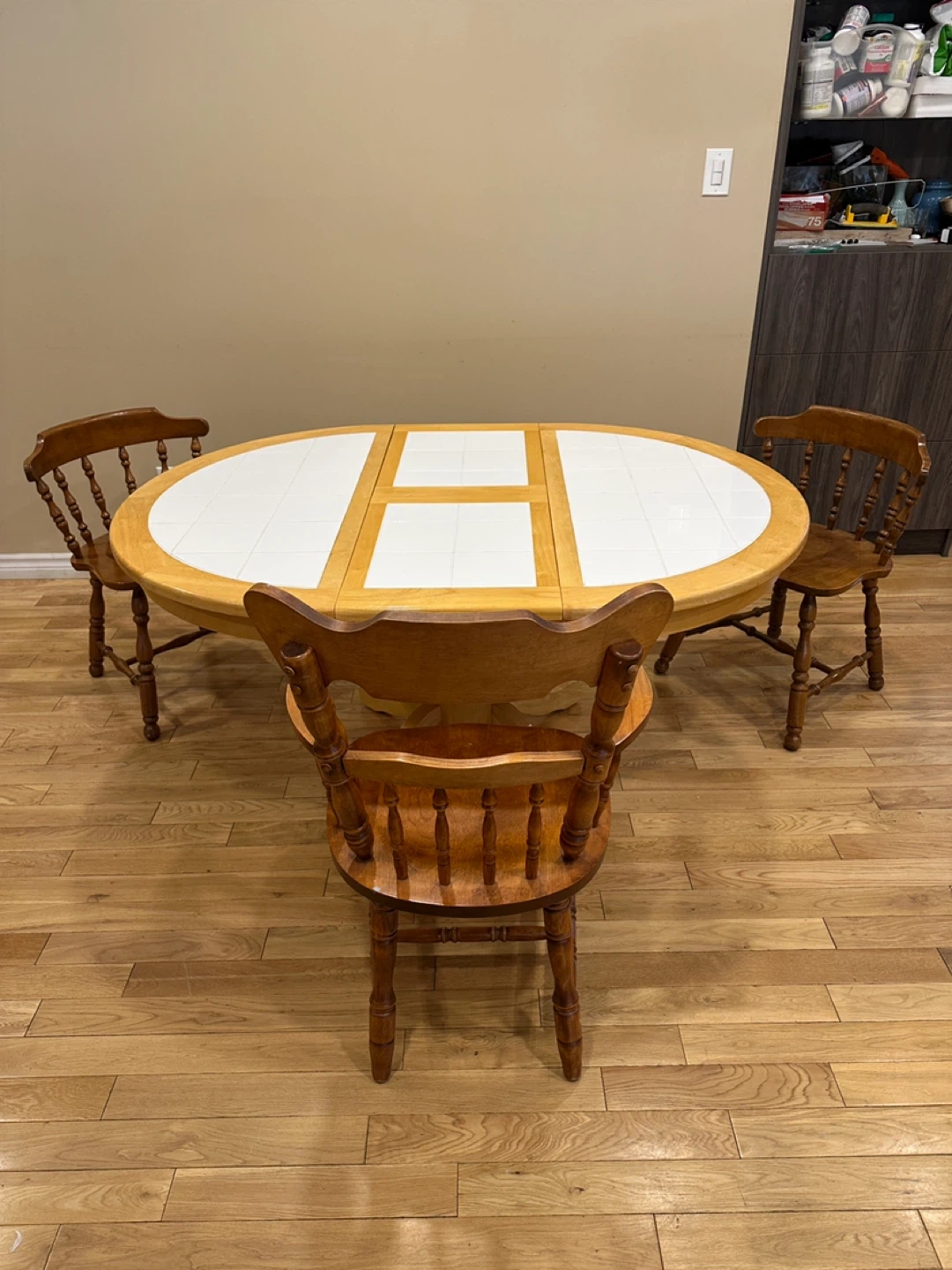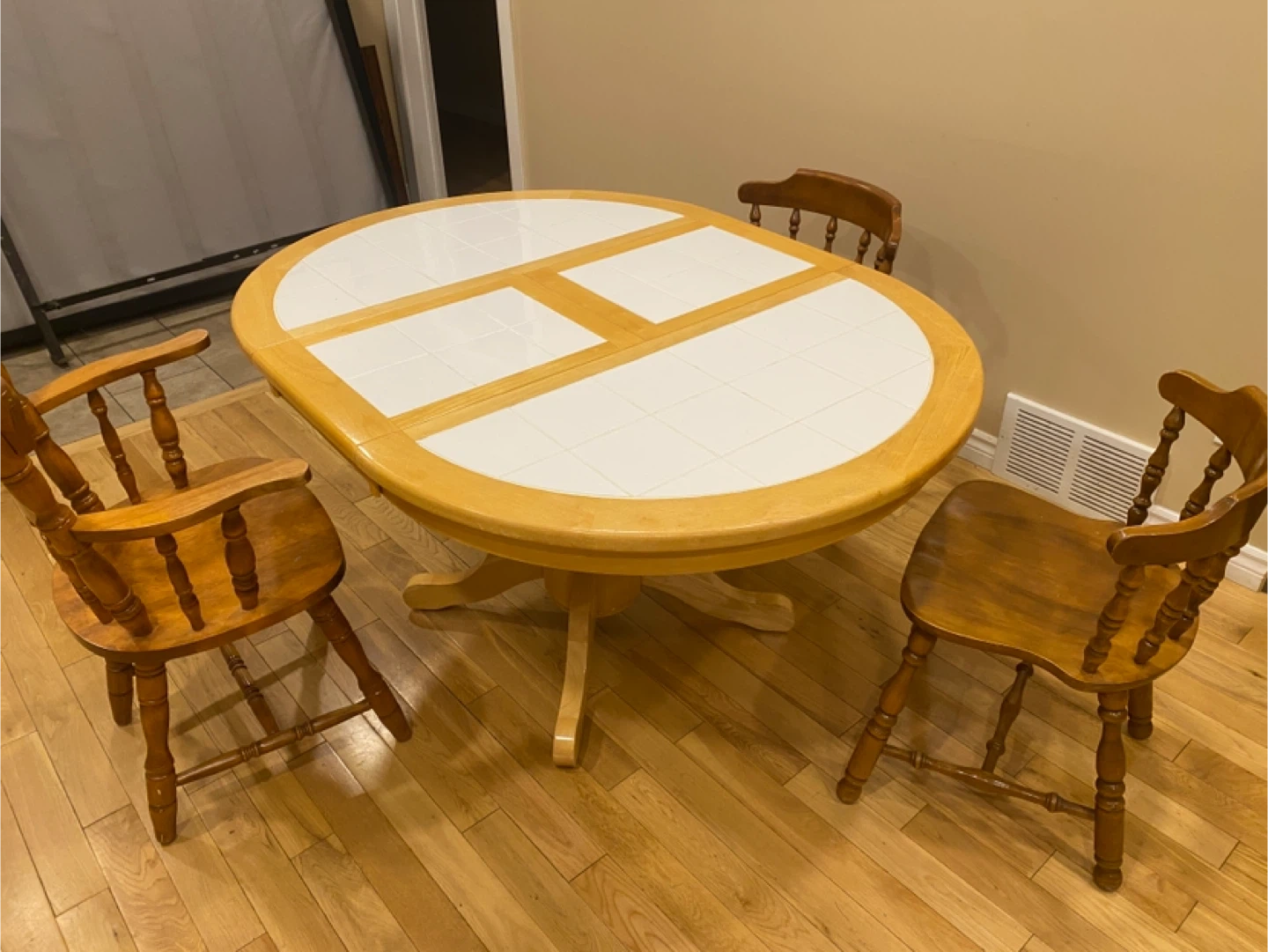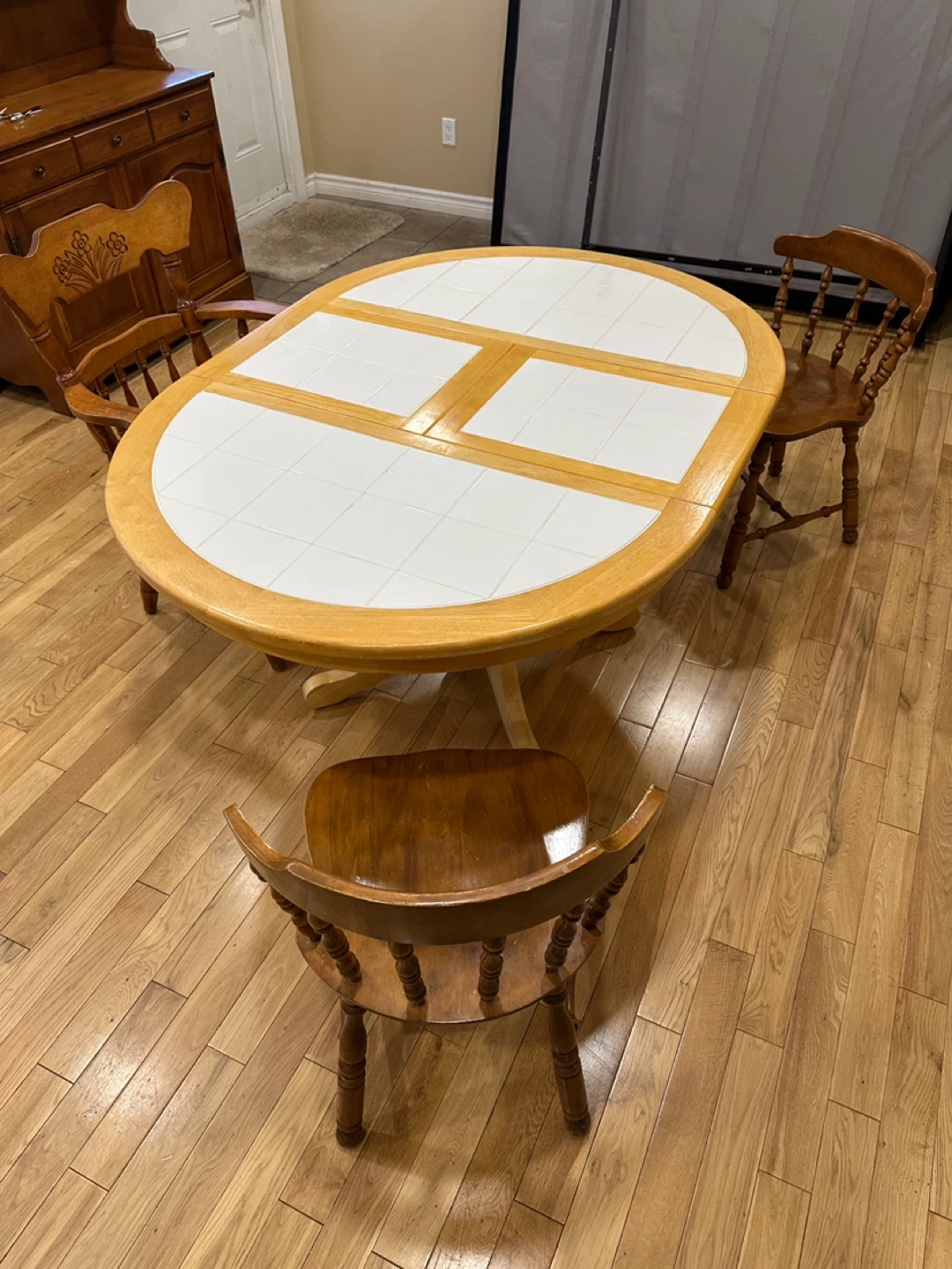 Beautiful country-style solid oak dining set featuring a round tile-inlay pedestal table with a 15β hidden butterfly extension leaf that folds away neatly under the table. Perfect for everyday use and great for entertaining!