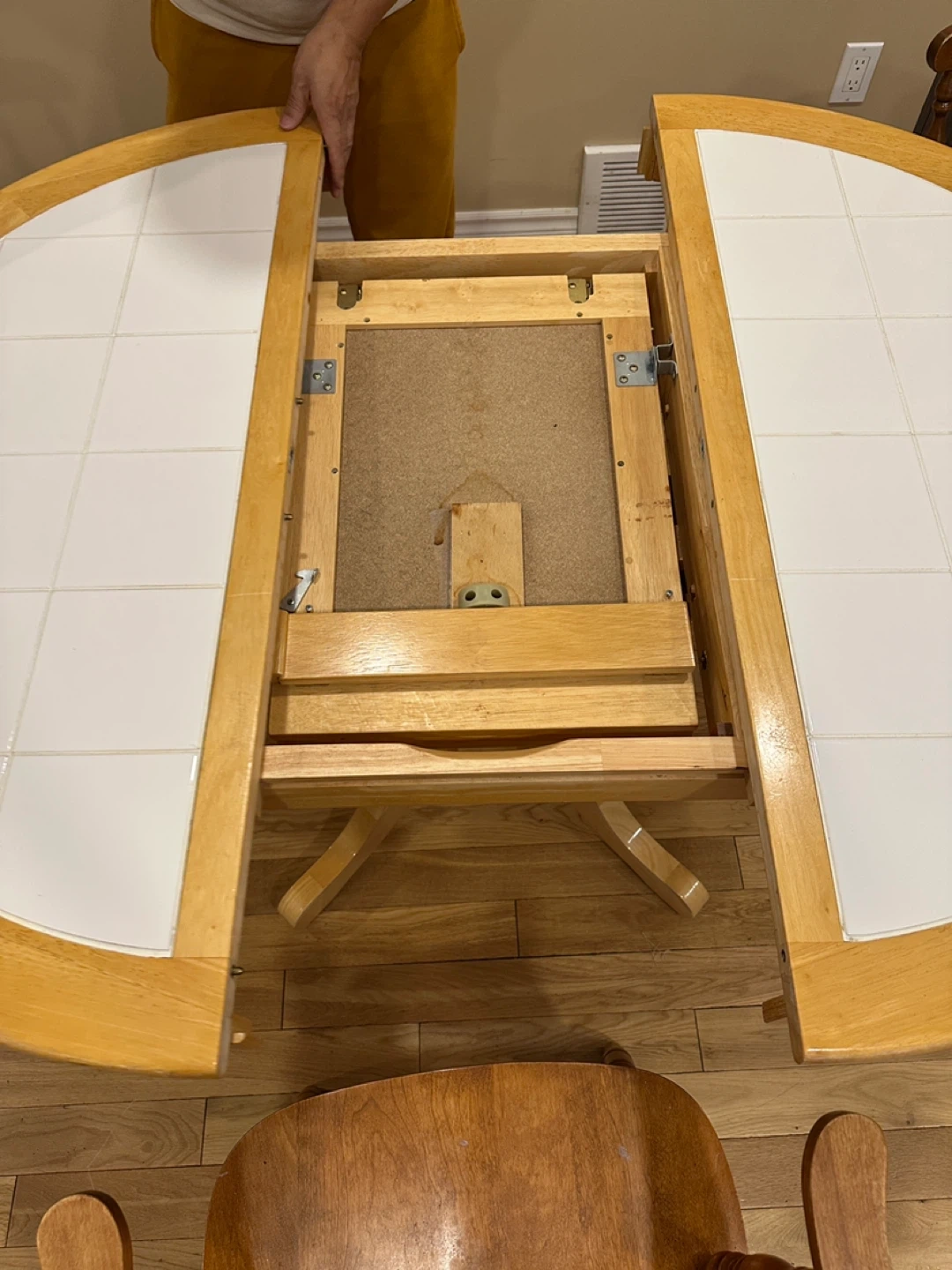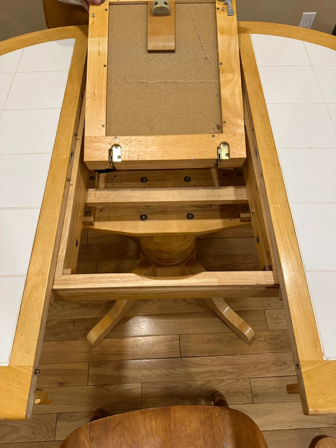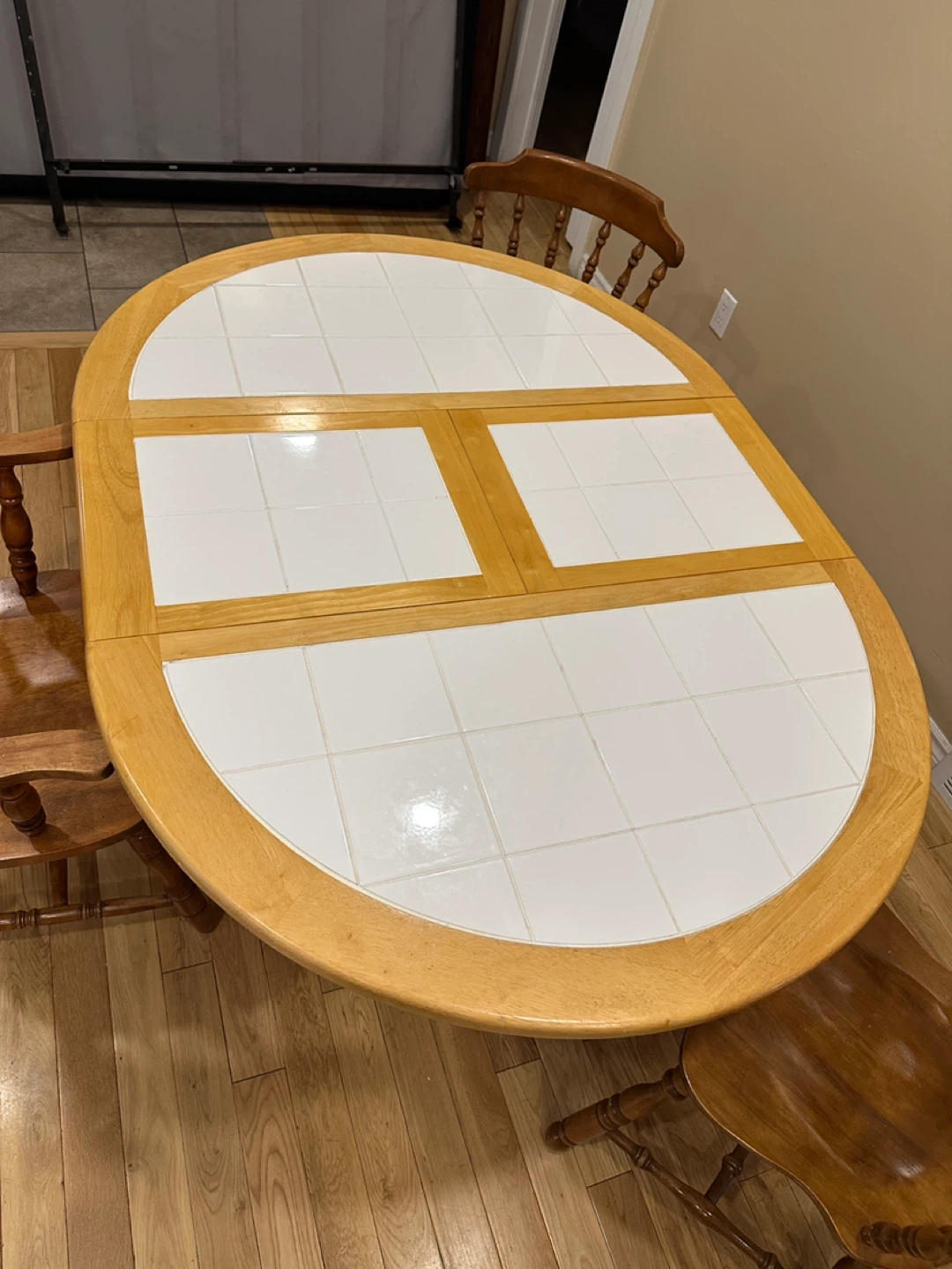 Beautiful country-style solid oak dining set featuring a round tile-inlay pedestal table with a 15β hidden butterfly extension leaf that folds away neatly under the table. Perfect for everyday use and great for entertaining!