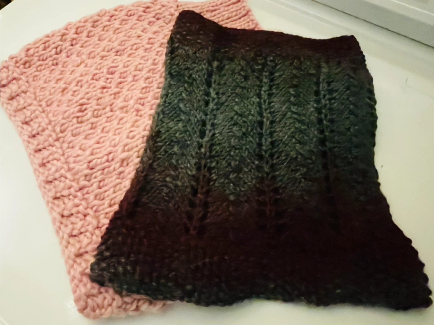 I have two handmade knitted neck warmers for sale. One is a lovely pink colour, and the other transitions from dark burgundy to grey. They're both in new and ready to keep you cozy!