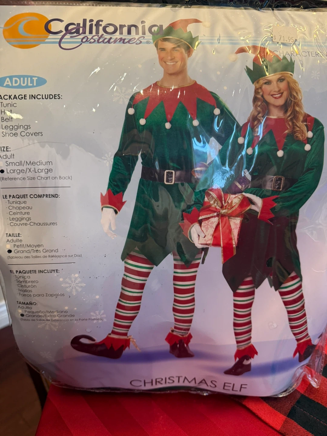 Get ready for the holidays with this fun adult Christmas Elf costume from California Costumes! This package includes everything you need to transform into a festive elf: a tunic, hat, belt, leggings, and shoe covers. It's a size Large/X-Large for adults.