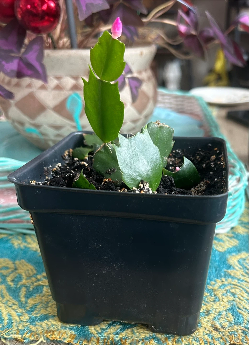 Selling a Christmas cactus in a black pot. It has a little pink bud ready to bloom! It's a beautiful plant to add some life to your home