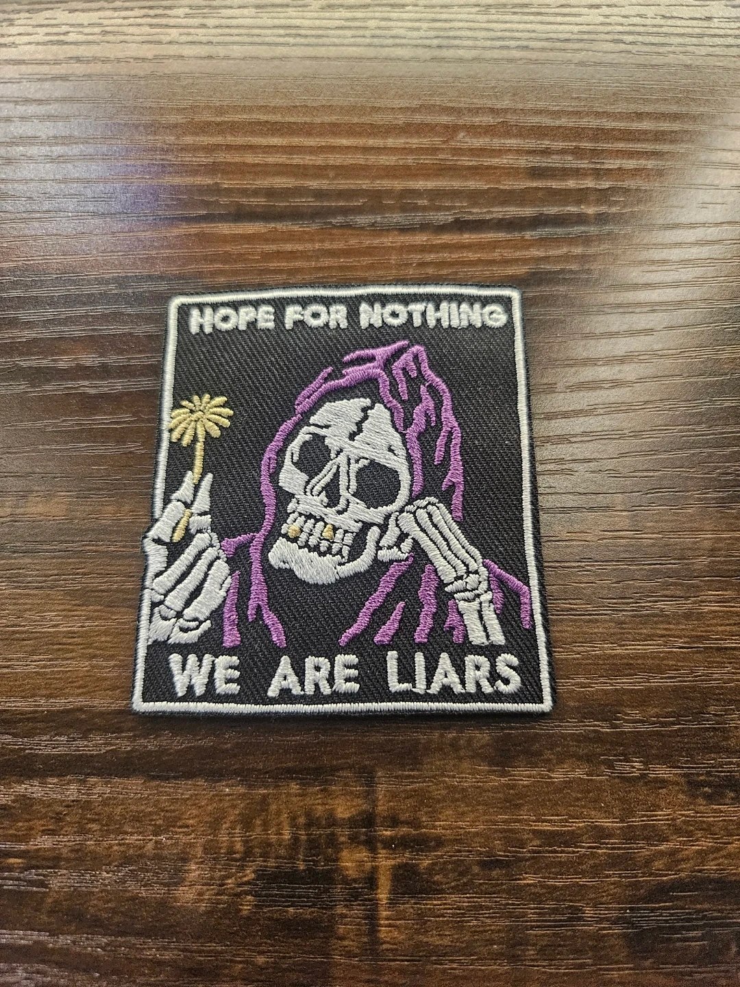 Selling a cool patch with a unique design! It features a skeleton figure and the text "Hope For Nothing" and "We Are Liars". Perfect for adding some personality to your jacket, backpack, or anything else you can think of!