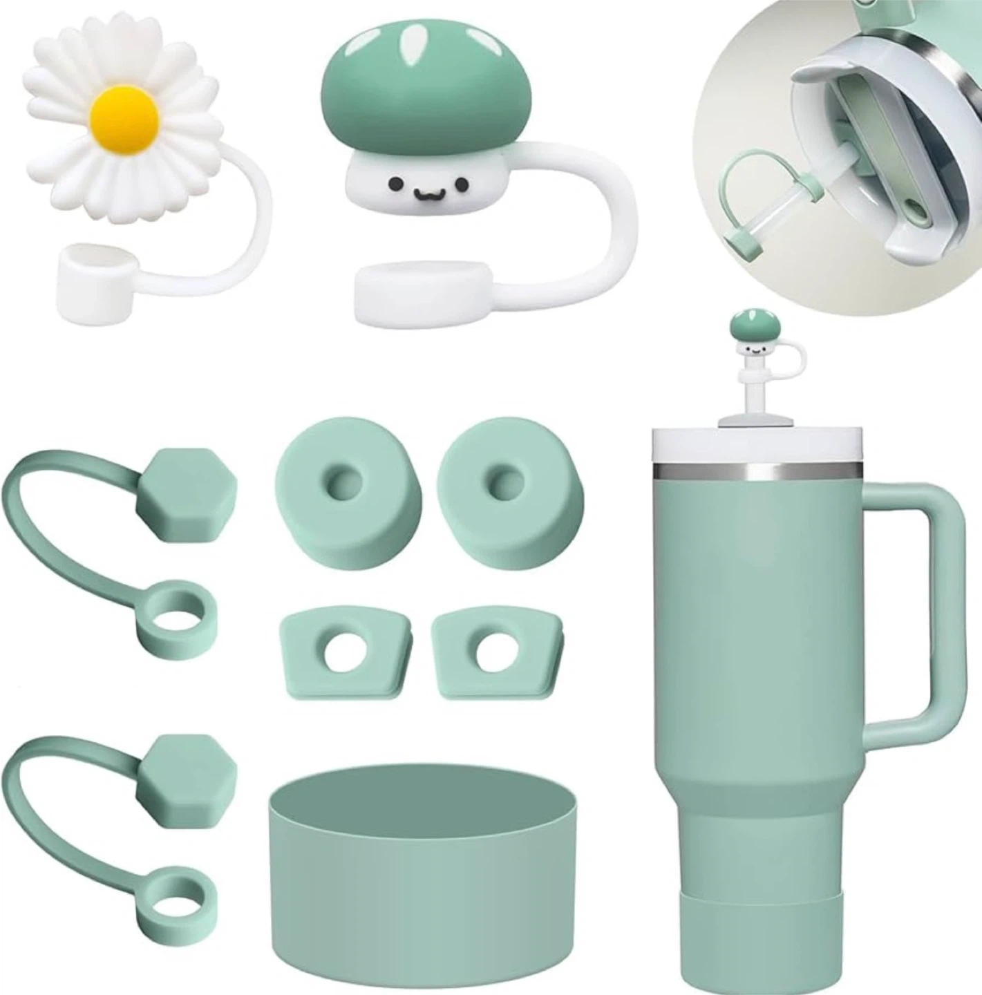 Upgrade your Stanley Cup with this full accessory set! Everything is brand-new and sealed. Includes silicone boot, straw cover, 6 spill stoppers, and adorable toppers (daisy + snowman). Fits both 12 oz and 24 oz cups.