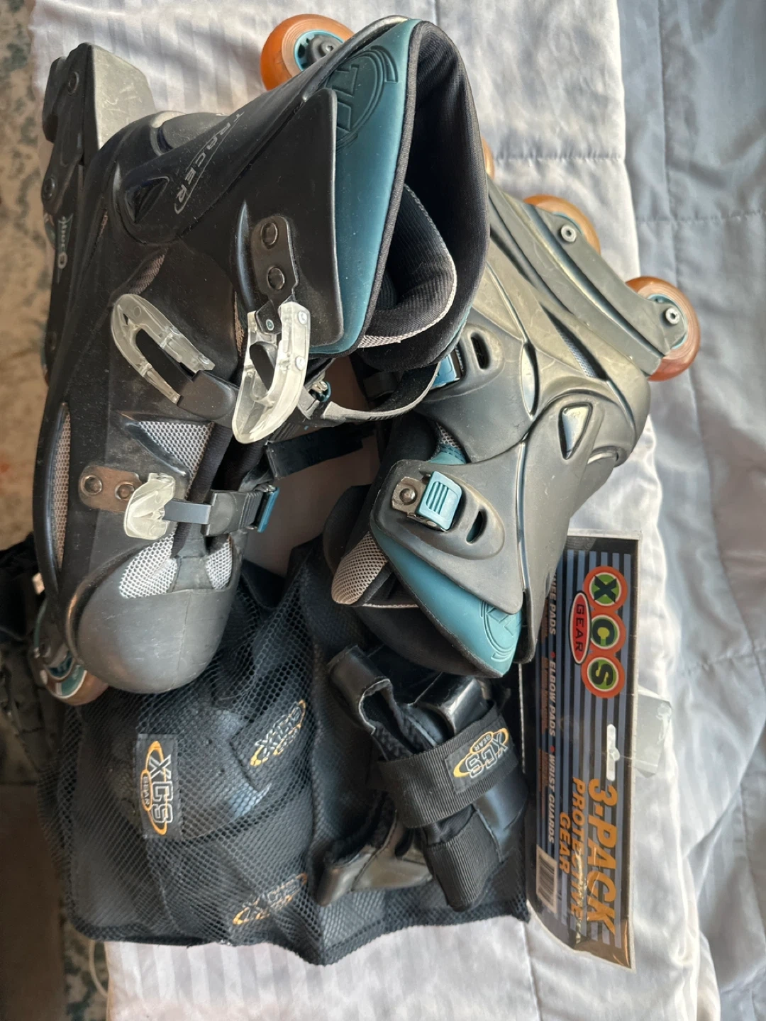 Selling a pair of Tracer inline skates. They come with protective gear, including knee pads, elbow pads, and wrist guards. Great for anyone looking to get into skating. Top left buckle needs repair.