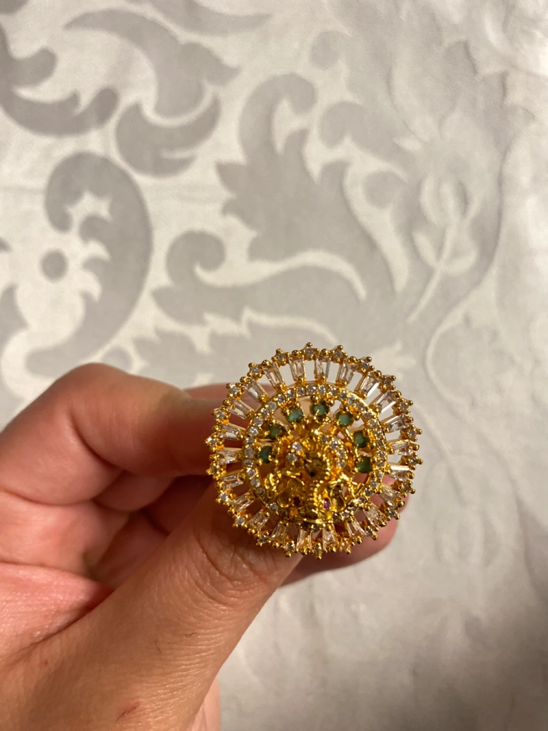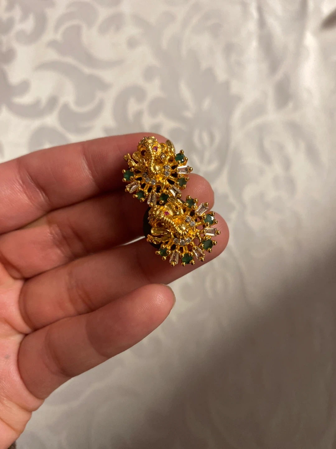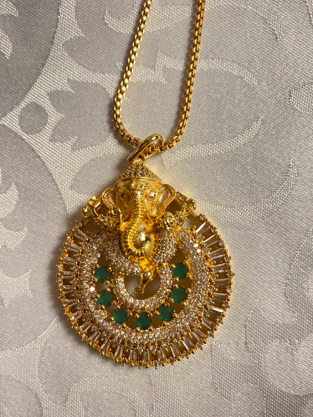 Beautiful gold plated Indian jewelry set, including a necklace with a Ganesha pendant, a ring, and a pair of earrings. Perfect for adding a touch of elegance to any outfit!