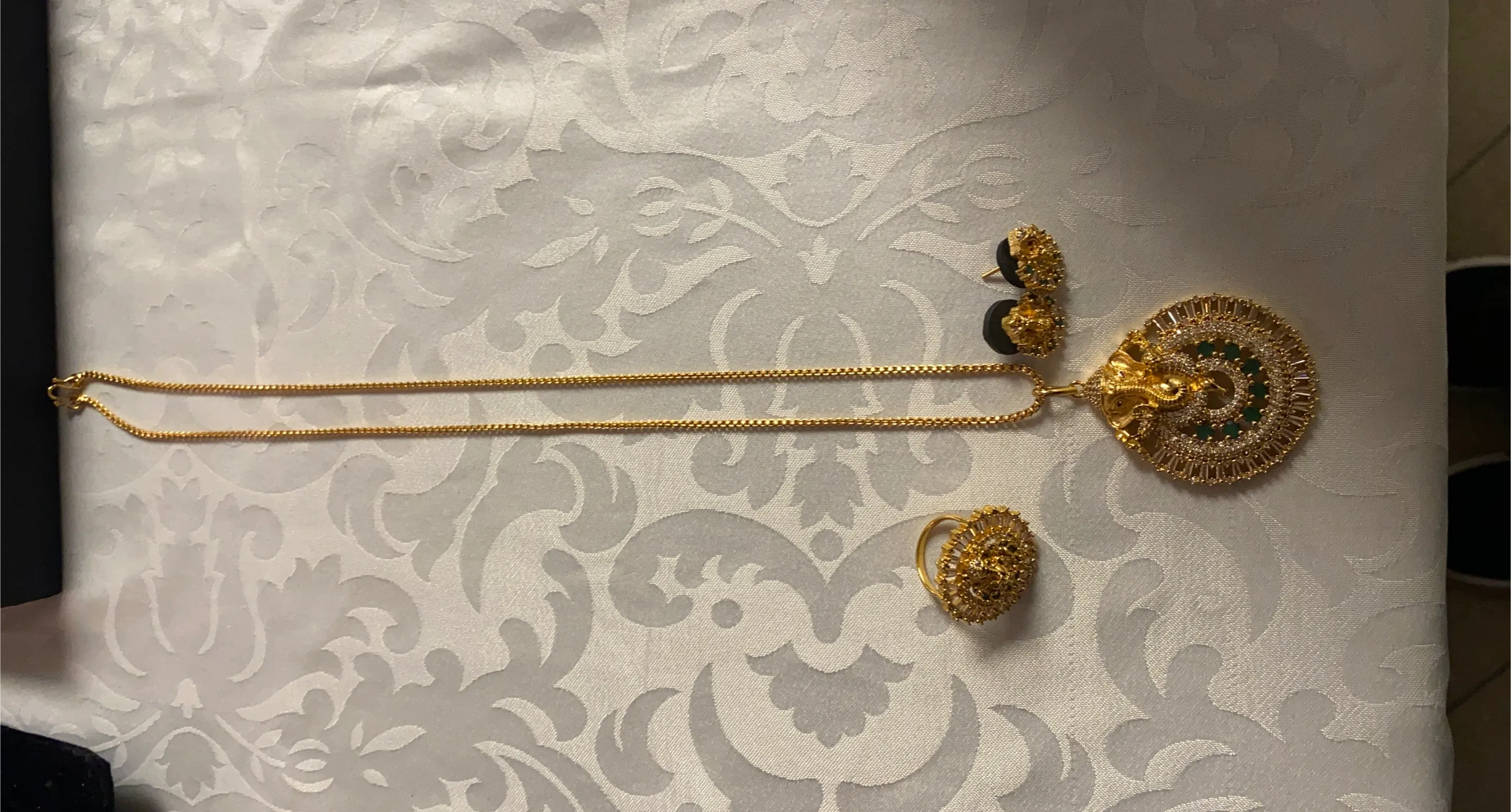 Beautiful gold plated Indian jewelry set, including a necklace with a Ganesha pendant, a ring, and a pair of earrings. Perfect for adding a touch of elegance to any outfit!