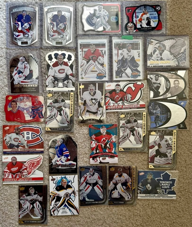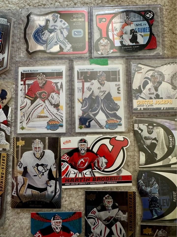 A collection of NHL hockey goalie trading cards featuring players like Henrik Lundqvist, Braden Holtby, Carey Price, Patrick Roy, Martin Brodeur, and Curtis Joseph. $30 for all the cards. Will consider offers or trades for interesting items. Pick up at the Sobeys at 2335 162 Ave SW in Bridlewood - Safe/well lit location.