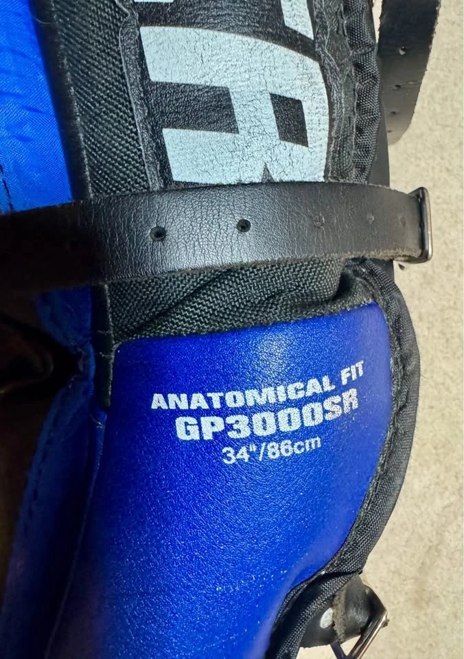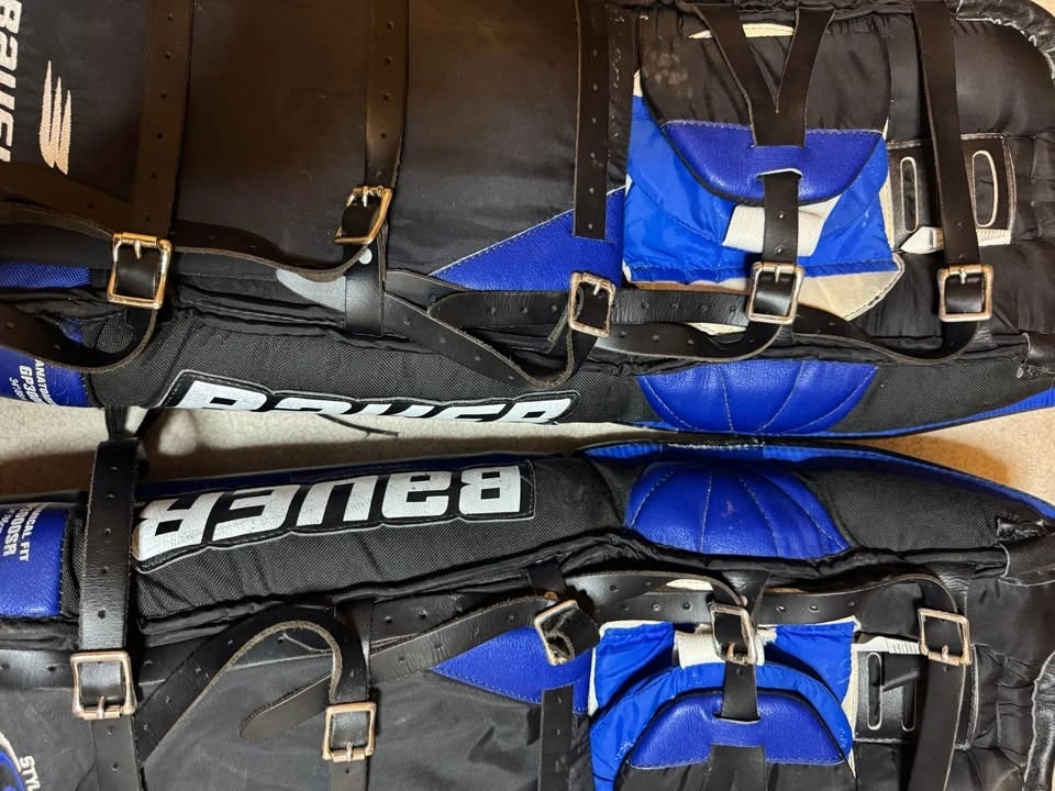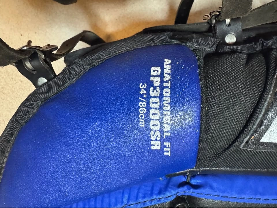 Used pair of Bauer GP 3000SR Reactor line of goalie hockey pads. Size 34”/86cm
