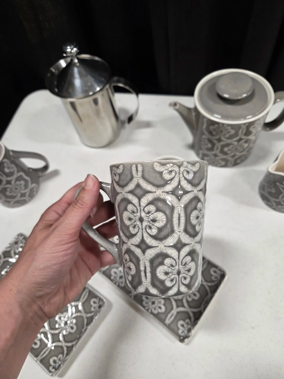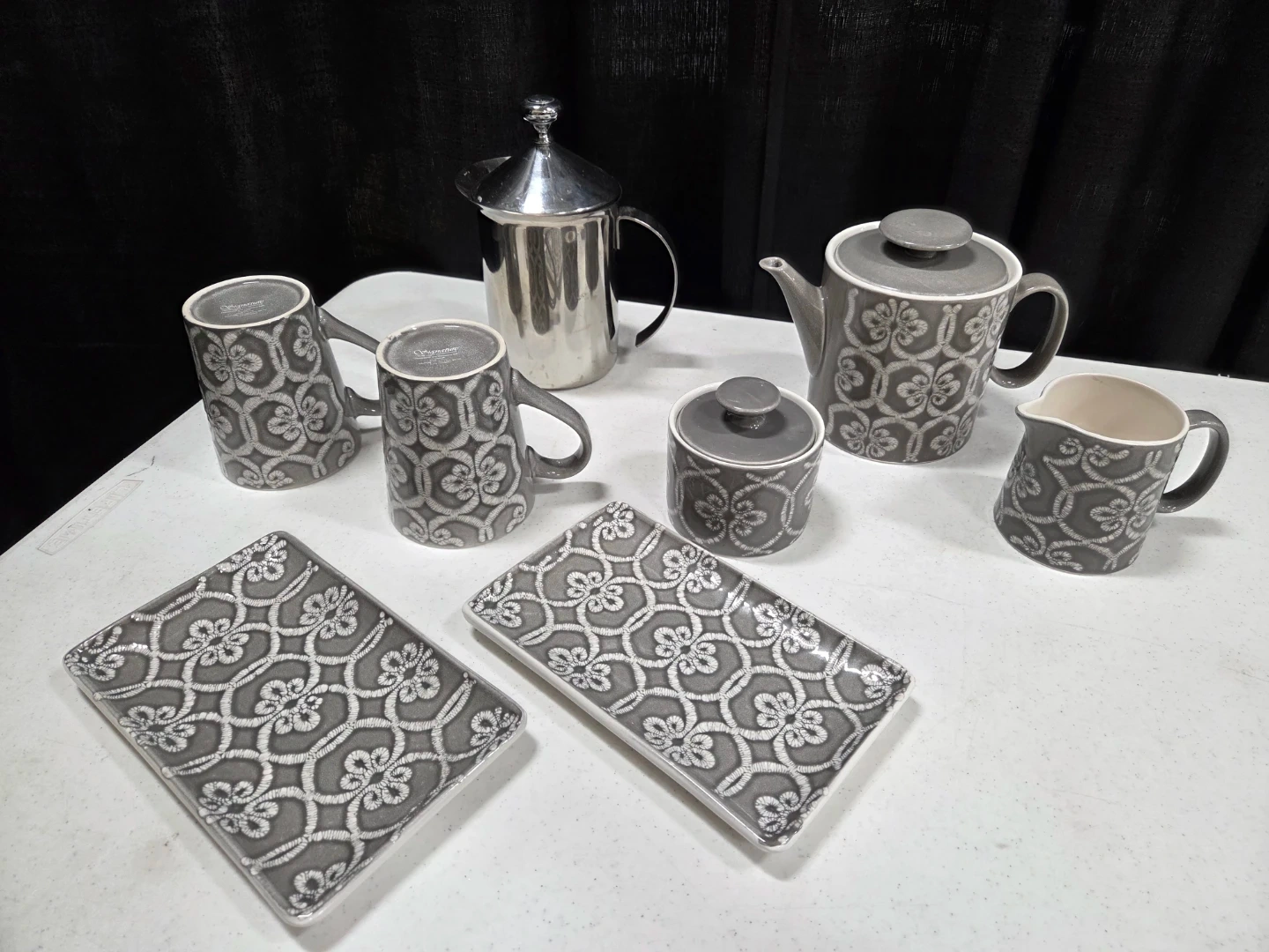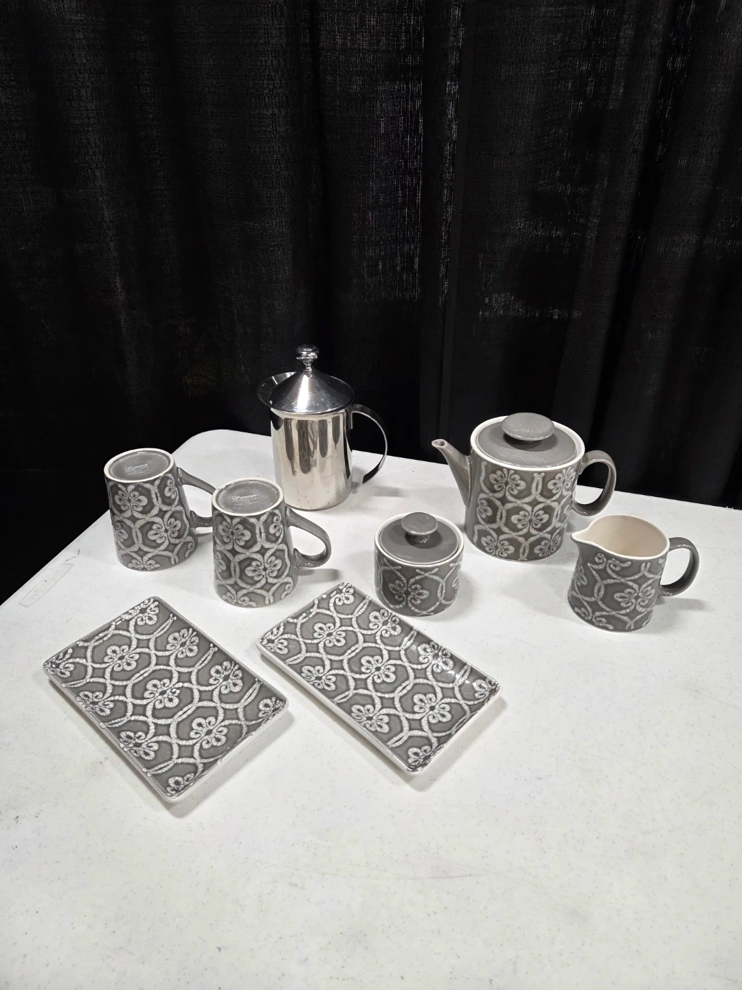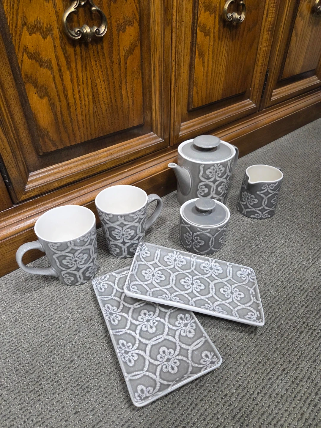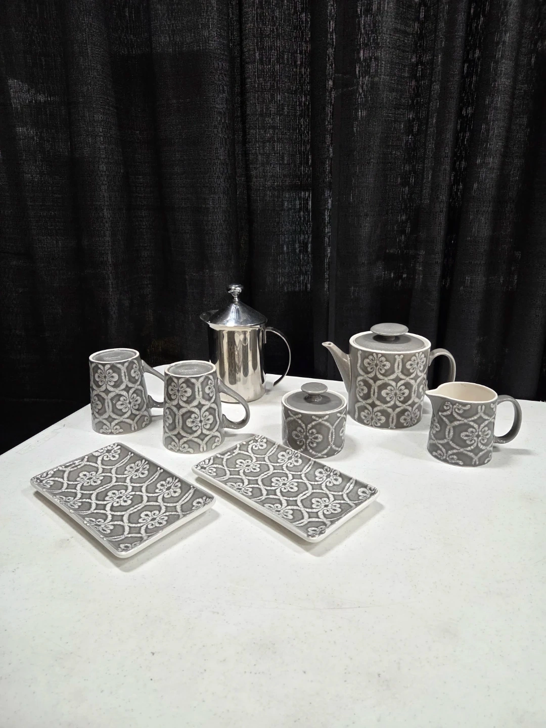 Selling a lovely vintage style NEW tea set, perfect for adding a touch of elegance to your tea time. The set features a unique gray ceramic design with a pattern. Includes teapot, creamer, sugar bowl, mugs, and plates. And a gently used milk frother is included if I can find it before you come. Reminde me !