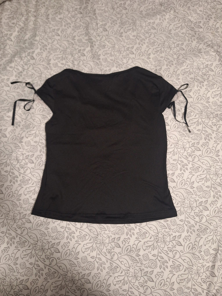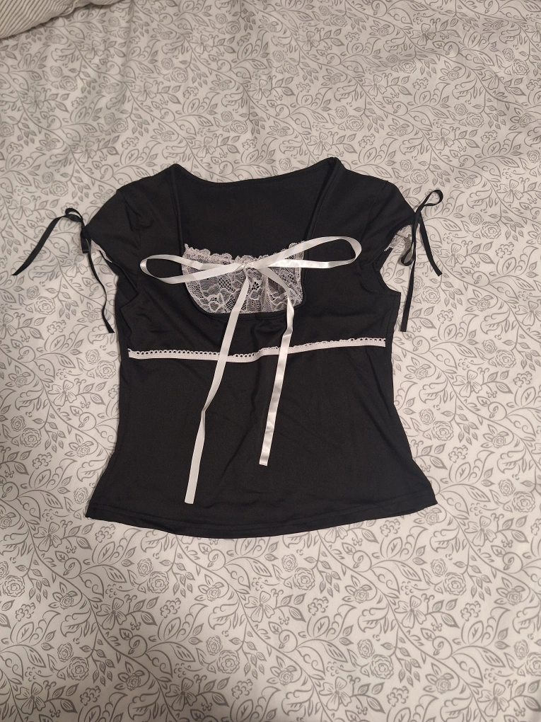 Cute black top with lace and ribbon detail! It's in great condition and would be a nice addition to any wardrobe.