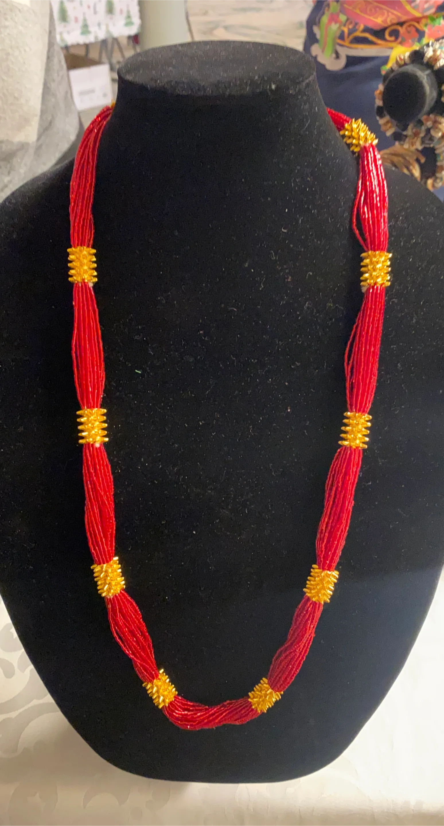 Beautiful red beaded necklace with gold-coloured accents. Perfect for adding a pop of colour to any outfit!