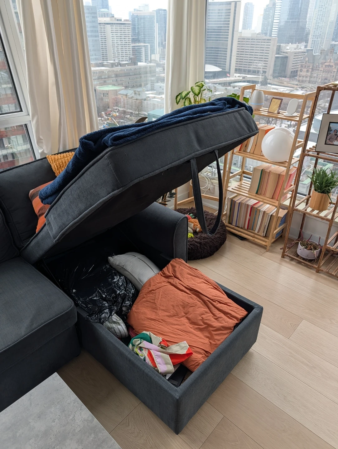 Selling a comfy grey sectional sofa! It's in great shape and perfect for lounging. It also has a handy storage compartment under the chaise for blankets or other items. It can also pull out into a double bed!