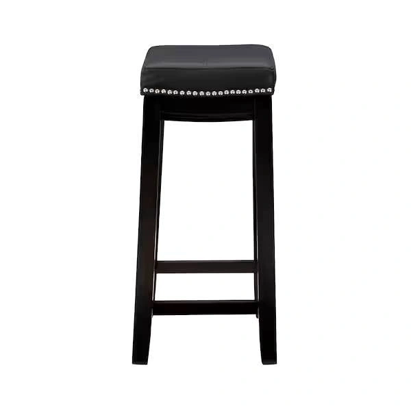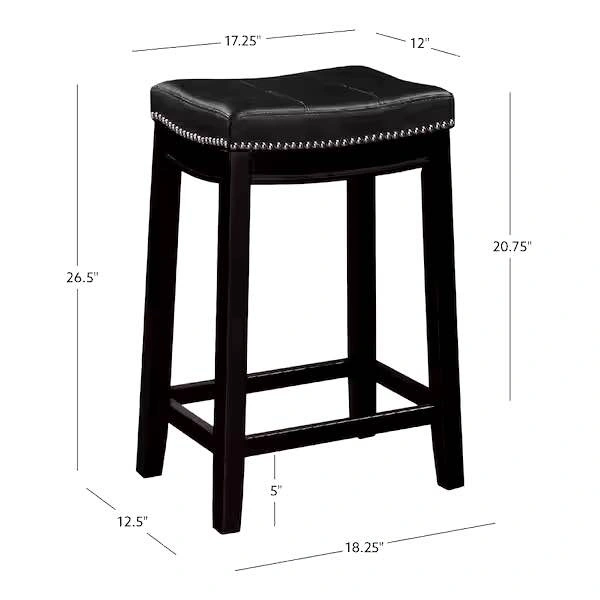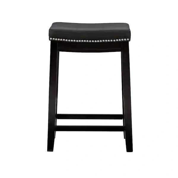 The Concord Black Counter Stool offers a perfect blend of style, comfort, and durability for your kitchen or bar area. Featuring a sleek black wood frame, this counter stool exudes a contemporary and sophisticated look that complements modern decor styles. The padded seat, upholstered in a black faux leather, provides a comfortable seating experience while being easy to clean and maintain. Silver nailhead trim and accent stitching adds a patchwork design to the top for an eyecatching detail. The backless and armless design promotes flexibility and allows for easy movement. The sturdy construction ensures stability and longevity, making this counter stool a practical and stylish addition to any home. 26.5" seat height is perfect for counter heights of 35-39 inches.