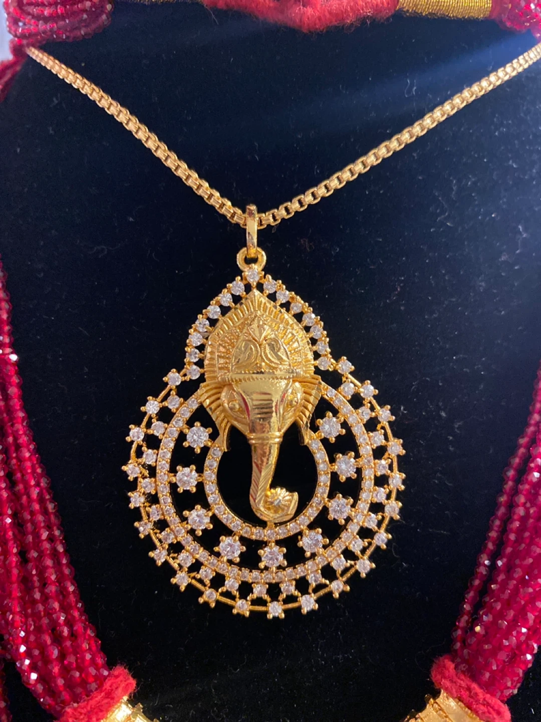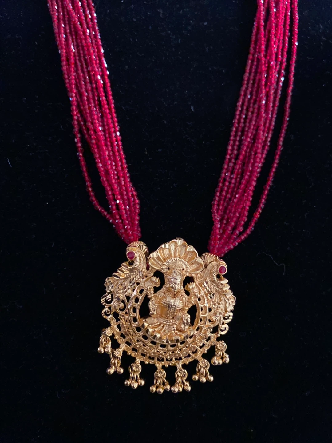 Beautiful red beaded necklace set with gold pendants. The set includes a multi-strand red beaded necklace with a gold pendant featuring an intricate design, a shorter necklace with a different gold pendant, and a third shorter gold chain necklace. These necklaces are perfect for adding a touch of elegance to any outfit!