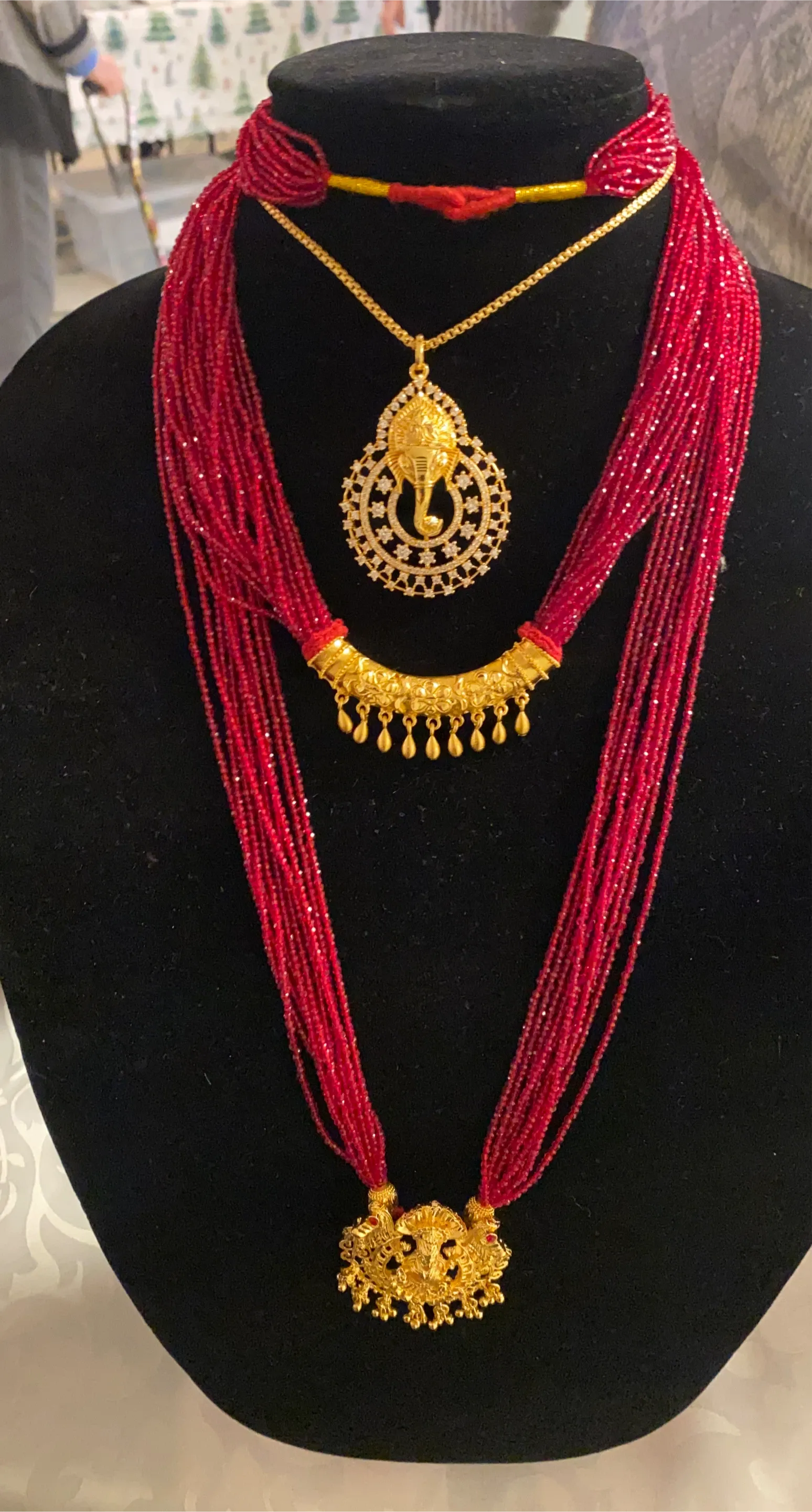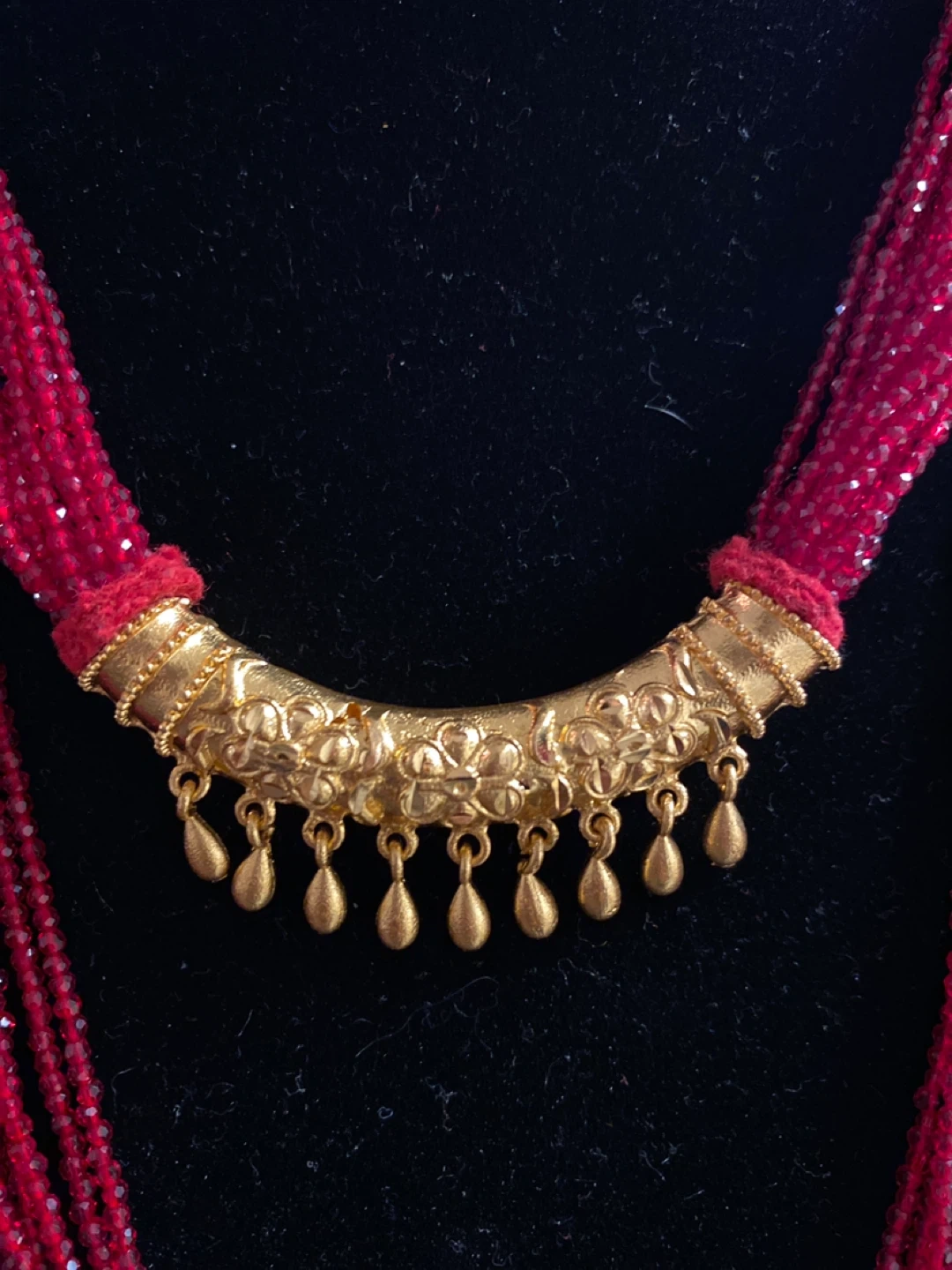 Beautiful red beaded necklace set with gold pendants. The set includes a multi-strand red beaded necklace with a gold pendant featuring an intricate design, a shorter necklace with a different gold pendant, and a third shorter gold chain necklace. These necklaces are perfect for adding a touch of elegance to any outfit!