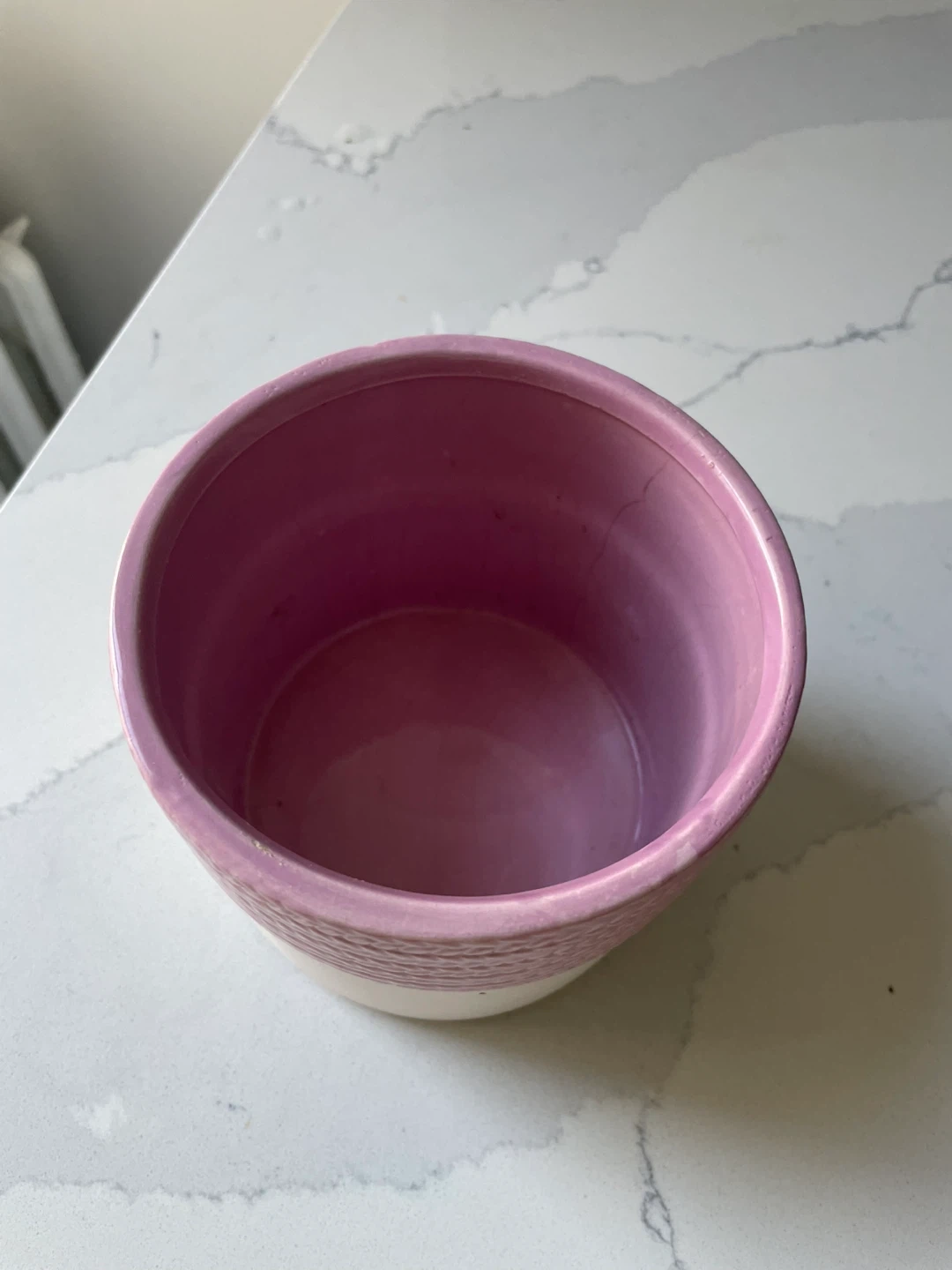 Selling a cute ceramic planter! It's pink on the inside and top half, with a white bottom. It would be perfect for a small plant or succulents for your home 🪴