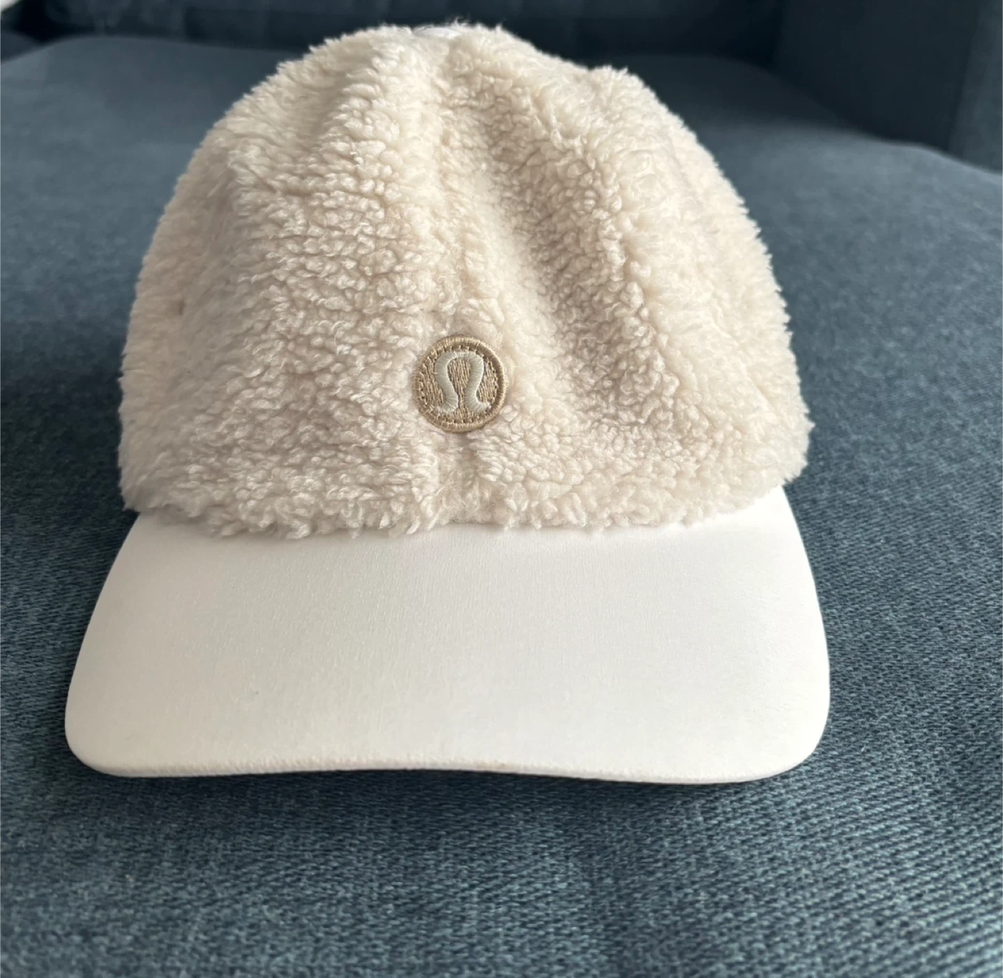 This is a super cute Lululemon baseball cap! It features a soft, fleece texture on the top and a solid white brim. Perfect for adding a cozy touch to your casual outfits!