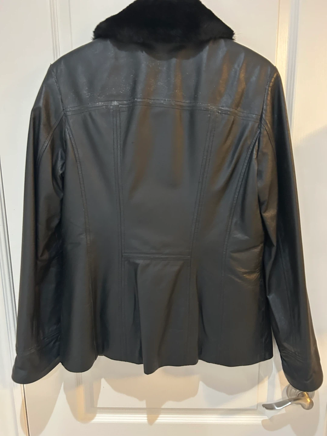 Short, black, buttoned leather coat. Faux fur collar. Slight salt stain on back. Fits size 8-10.
