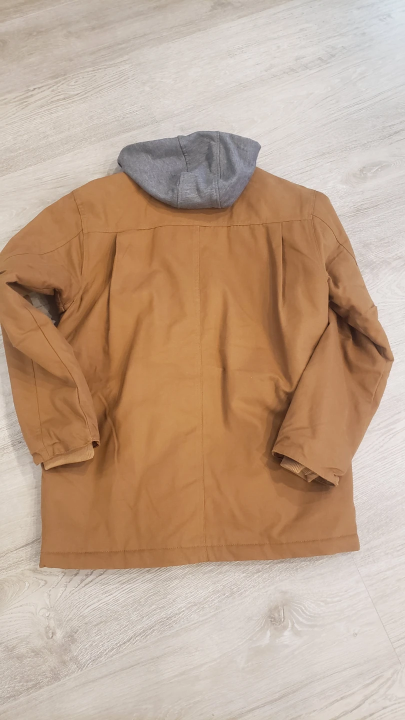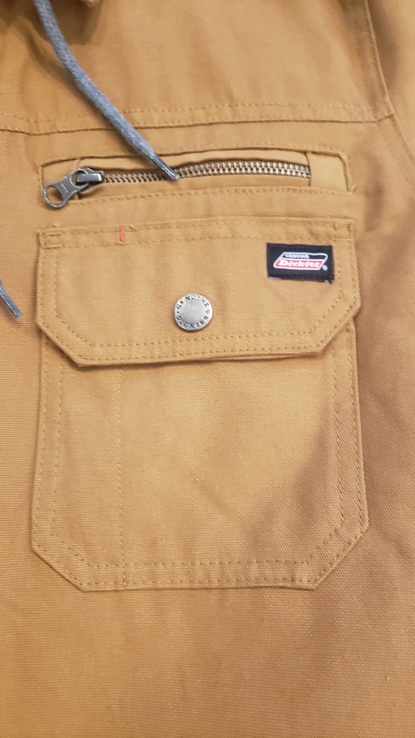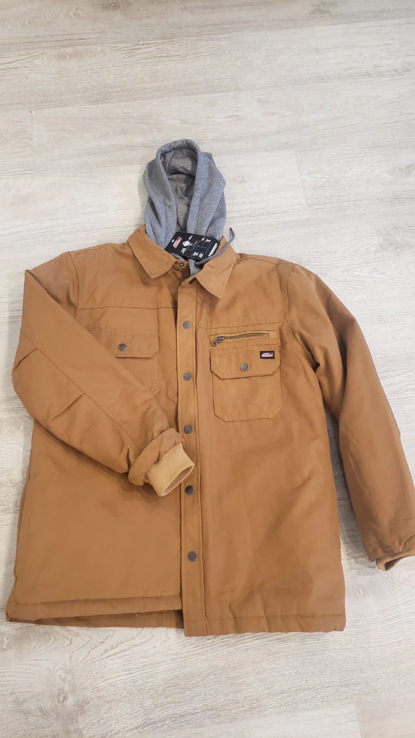 I'm selling a Dickies hooded canvas shirt jacket in size large. It's a warm, quilted insulated jacket with lined handwarmer pockets and a double front closure to keep the wind out. The jacket is a nice brown colour with a grey hood. Feel free to message me if you're interested!